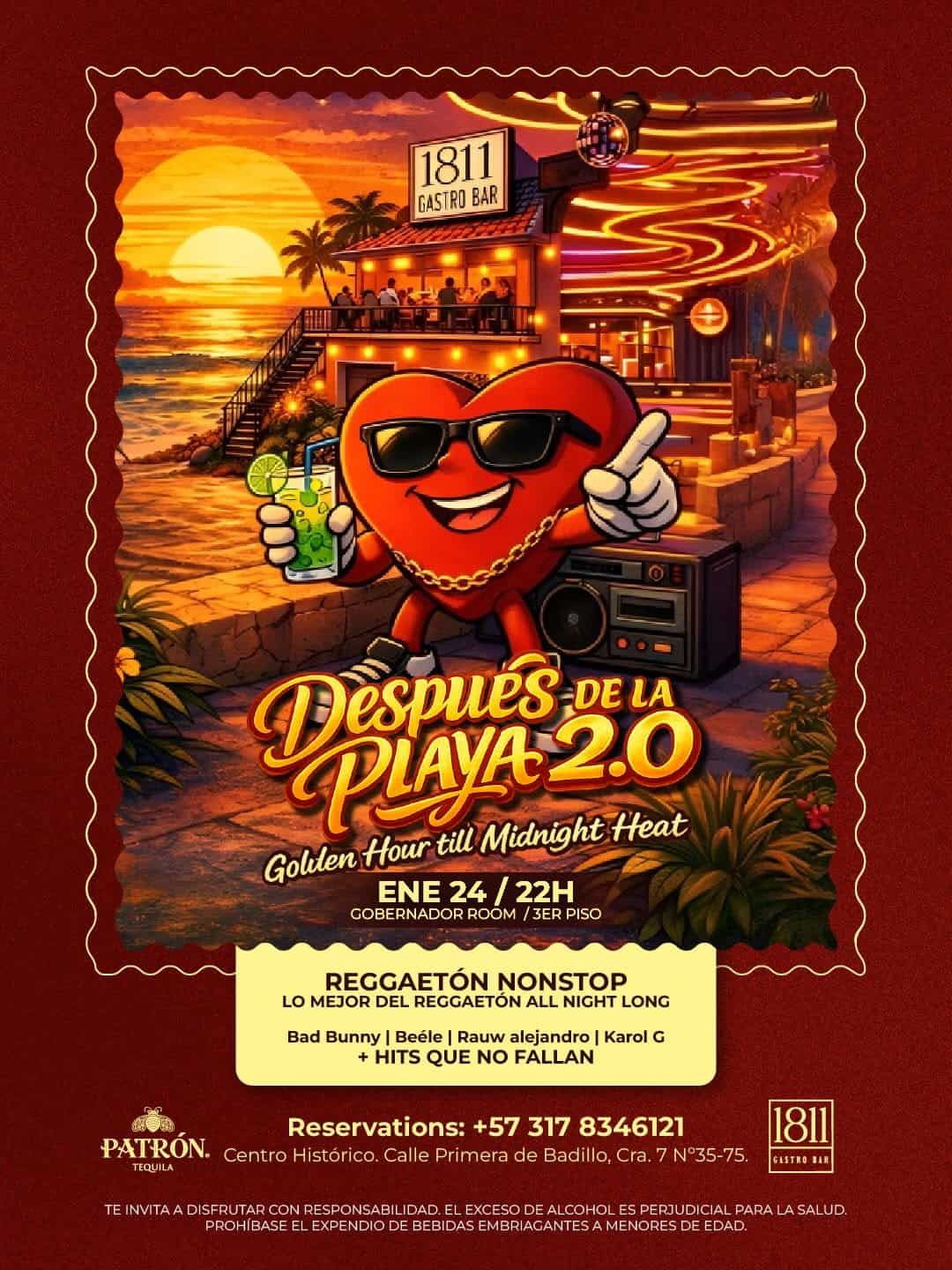 Después de la Playa 2.0 es la fiesta que no te puedes perder en Cartagena. En el 1811 Gastro Bar, te esperamos con la mejor música reggaetón de la mano de nuestro DJ invitado Kevin Suárez. Prepárate para bailar sin parar con los hits que nunca fallan. Además, contaremos con combos Patrón listos para que la rumba no pare. Recuerda, lo que pase aquí, se queda aquí.