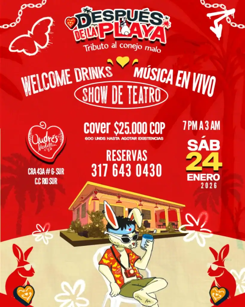 El viernes 23, sábado 24 y domingo 25 nuestro hogar se convierte en la casita de las almas rumberas. Welcome drinks, banda en vivo, shows de actores y grandes noches de tributo al conejo malo. ¡Si presentas tu entrada al concierto tienes un precio especial en el valor del cover!