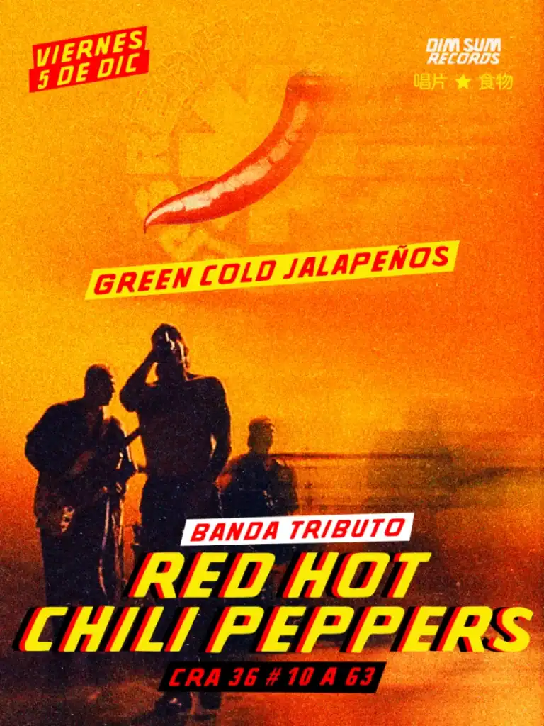 Este viernes 5 de diciembre, Dim Sum Records se prende con un show en vivo lleno de funk rock y energía californiana. La banda Green Cold Jalapeños llega para rendir tributo a los RHCP con un sonido potente, picante y directo al pecho. Una noche para sudar, saltar y dejarse llevar por clásicos que hicieron historia.
