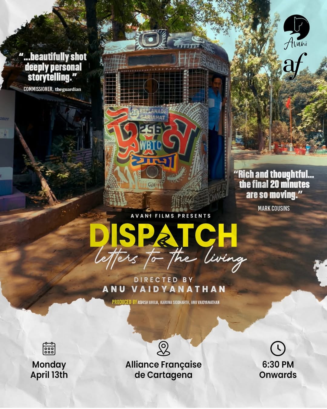 “DISPATCH Letters to the Living” es una proyección de cine en la Alianza Colombo Francesa de Cartagena, dirigida por Anu Vaidyanathan. Este documental explora la memoria, los archivos, la herencia, la ciencia y la identidad desde una perspectiva íntima y reflexiva. Al finalizar la función habrá un espacio de conversación abierta con el público, ideal para profundizar en los temas del filme y dialogar sobre su impacto en la ciudad de Cartagena.