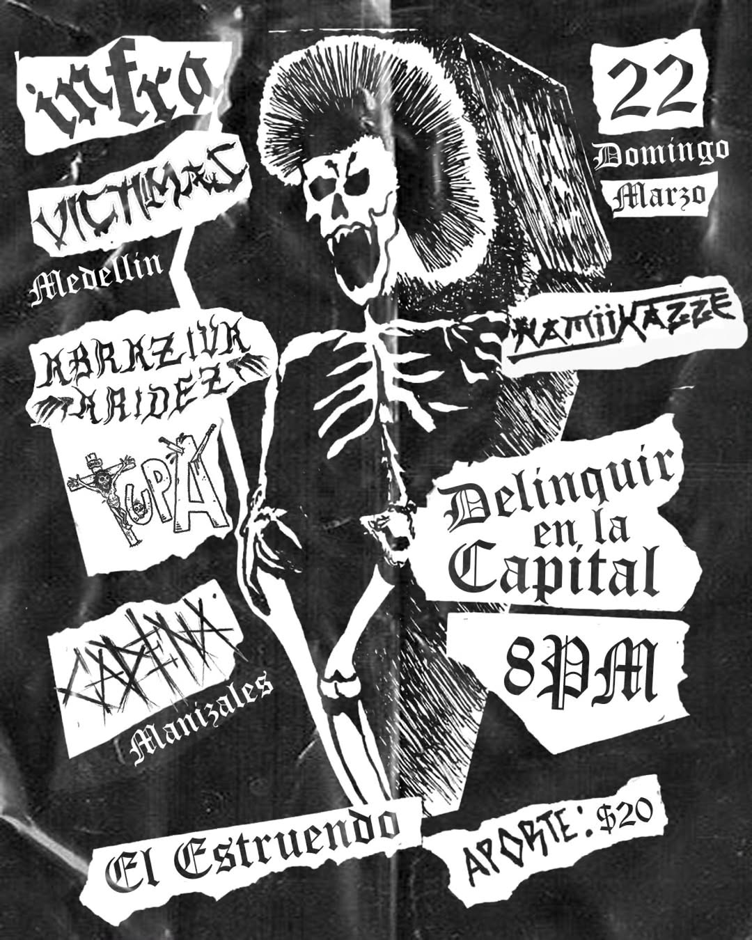 El Estruendo Punk ‘N’ Roll presenta la fecha Delinquir en la Capital, una noche de concierto punk en Bogotá con bandas como Infrapunk, Víctimas, Kamikazze, Abraziva Aridez, Cadena Punk y más. El Estruendo Bar será el punto de encuentro para los amantes del punk rock colombiano, con un ambiente crudo, ruidoso y contestatario ideal para poguear, cantar y apoyar la escena underground de la ciudad.