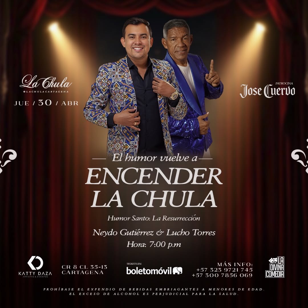 El humor vuelve a ENCENDER LA CHULA con una noche de comedia en vivo en La Chula Cartagena. Neydo Gutiérrez y Lucho Torres se unen en el show “Humor Santo: La Resurrección” para ofrecer un plan de risas, buena energía y entretenimiento en Cartagena. Un espacio ideal para disfrutar de stand up comedy entre amigos, con ambiente festivo y la chispa característica de este venue.