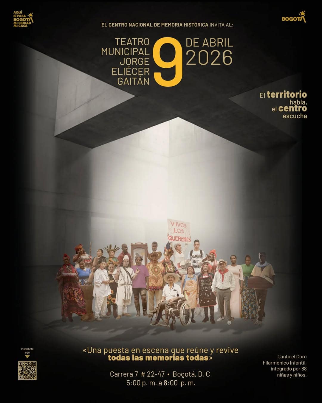 El territorio habla, el centro escucha es un acto de memoria y reflexión en el Teatro Jorge Eliécer Gaitán de Bogotá, organizado por el Centro Nacional de Memoria Histórica. Este evento tipo teatro reúne experiencias, relatos y homenajes a las víctimas del conflicto armado, con espacios inmersivos como recorridos simbólicos y un componente artístico coral. Es una oportunidad para acercarse al Museo de Memoria de Colombia y a las voces de los territorios que resisten al olvido.