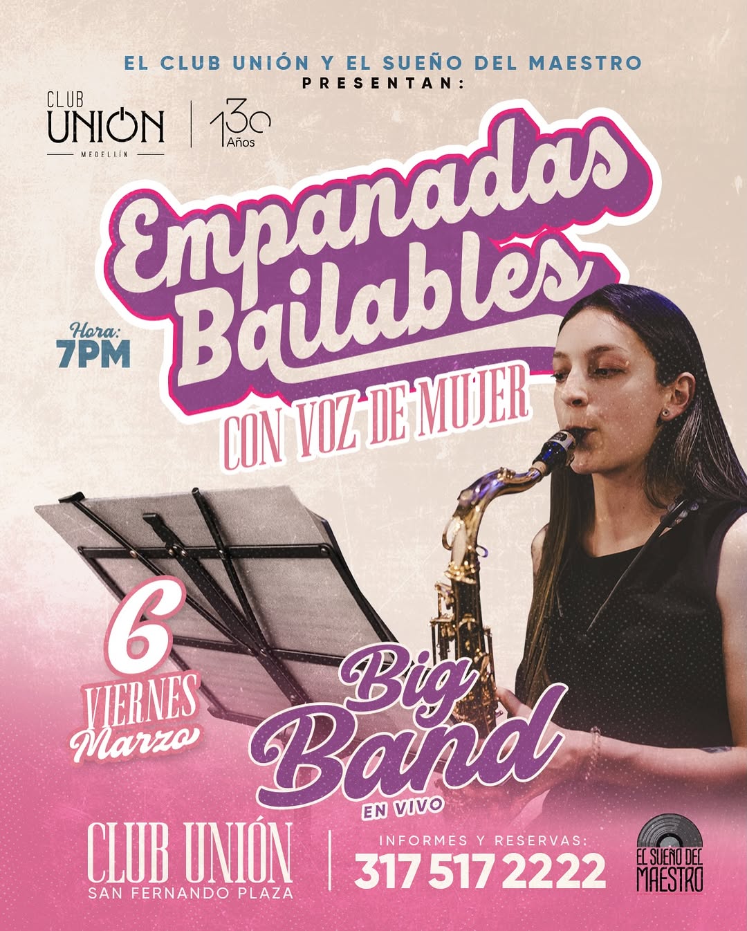 Empanadas Bailables con Voz de Mujer es una noche dedicada a resaltar el talento femenino en la música en vivo, con formato de big band y ritmos tradicionales en Medellín. En el Club Unión, la agrupación El Sueño del Maestro propone un viaje sonoro por grandes orquestas, gaitas y cumbias inspiradas en mujeres, invitando a bailar, cantar y disfrutar de una experiencia emotiva y festiva.