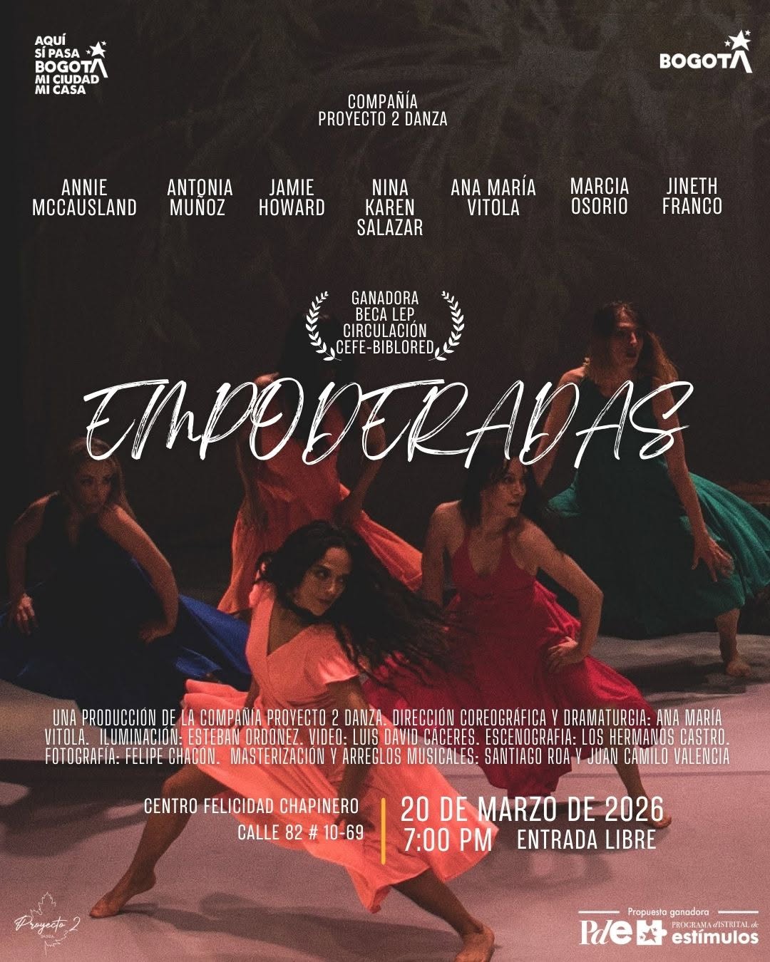 Empoderadas es una obra de danza contemporánea interdisciplinar de la Compañía Proyecto 2 Danza en Bogotá, que rinde homenaje a mujeres víctimas del conflicto armado y de las violencias de género. A través del movimiento, la imagen y el canto, el espectáculo explora su fuerza, resiliencia y procesos de empoderamiento, creando una experiencia escénica emotiva y esperanzadora. Con dirección coreográfica y dramaturgia de Ana María Vitola, integra recursos visuales y musicales para ofrecer una propuesta artística potente y conmovedora.