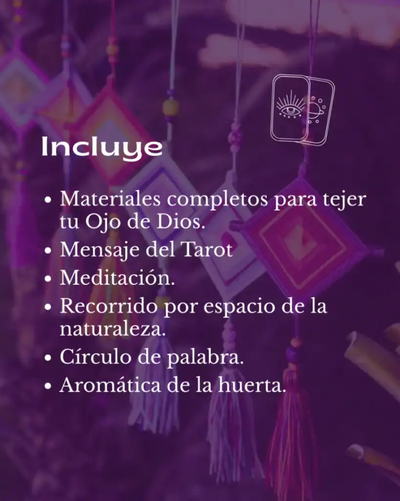 Después pasamos al tejido del Ojo de Dios. El acto de tejer tiene algo profundamente terapéutico: baja la información al cuerpo, aquieta la mente y permite que el proceso se asiente. Cada vuelta de hilo acompaña lo que la carta mostró, ayudando a integrarlo de manera consciente y presente.
