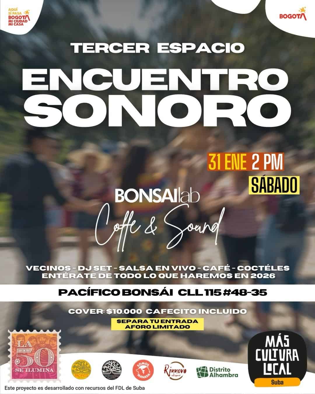 Disfruta de un encuentro social con música en vivo en BONSAIlab Coffe & Sound en Bogotá. Este evento, organizado por MÁS CULTURA LOCAL – Suba, te invita a disfrutar de un DJ SET y salsa en vivo. Además, podrás disfrutar de un delicioso café y cocteles. No te pierdas esta oportunidad de disfrutar de la música y la cultura local.