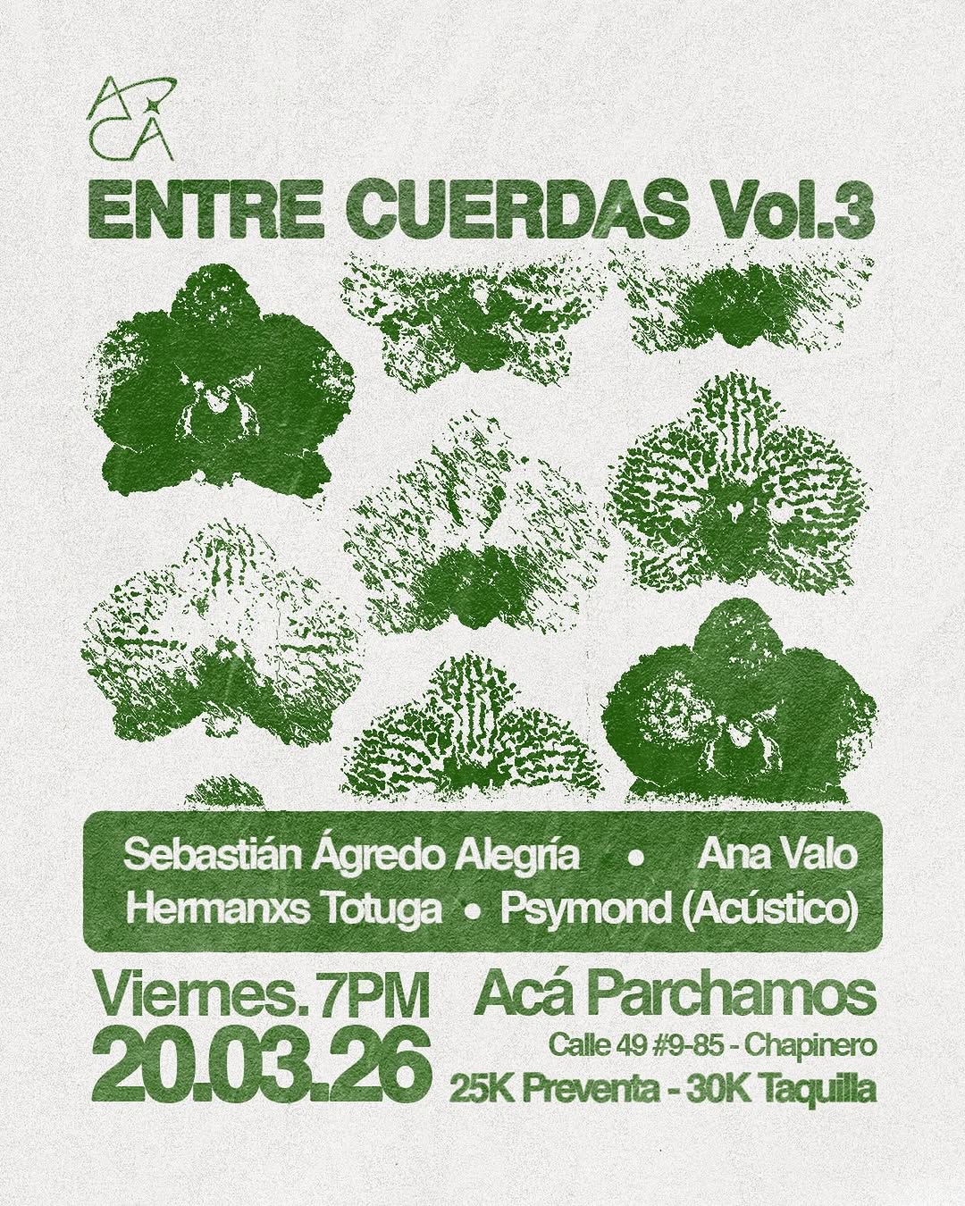 ENTRE CUERDAS Vol. 3 es un concierto acústico íntimo en Acá Parchamos, ideal para quienes disfrutan la música en formato cercano y sin filtros en Bogotá. En esta edición se presentan Noagredo, Hermanxs Totuga, Ana Valo y Psymond en versión acústica, creando una noche de cuerdas, voces y conexión directa con el público. Un espacio perfecto para descubrir artistas locales y vivir una experiencia musical tranquila y acogedora.