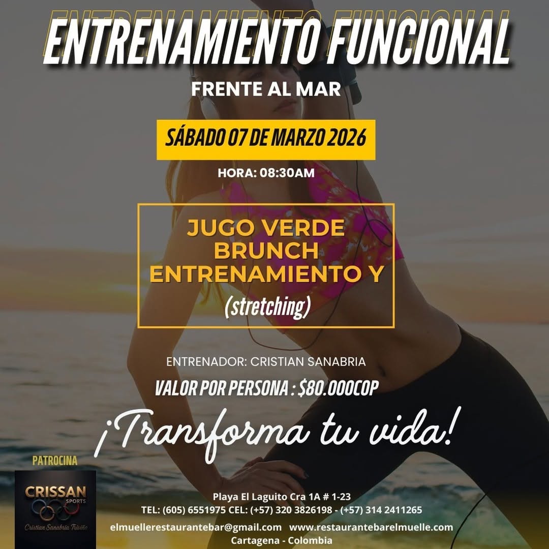 Entrenamiento funcional frente al mar es una experiencia de bienestar en Cartagena que combina ejercicio, respiración consciente y comunidad para empezar el día con energía. En El Muelle, frente a la playa El Laguito, podrás entrenar con enfoque funcional, disfrutar de jugo verde, un brunch saludable y una sesión de stretching para relajar el cuerpo. Una actividad ideal para quienes buscan un espacio de movimiento, salud y estilo de vida activo en la ciudad.