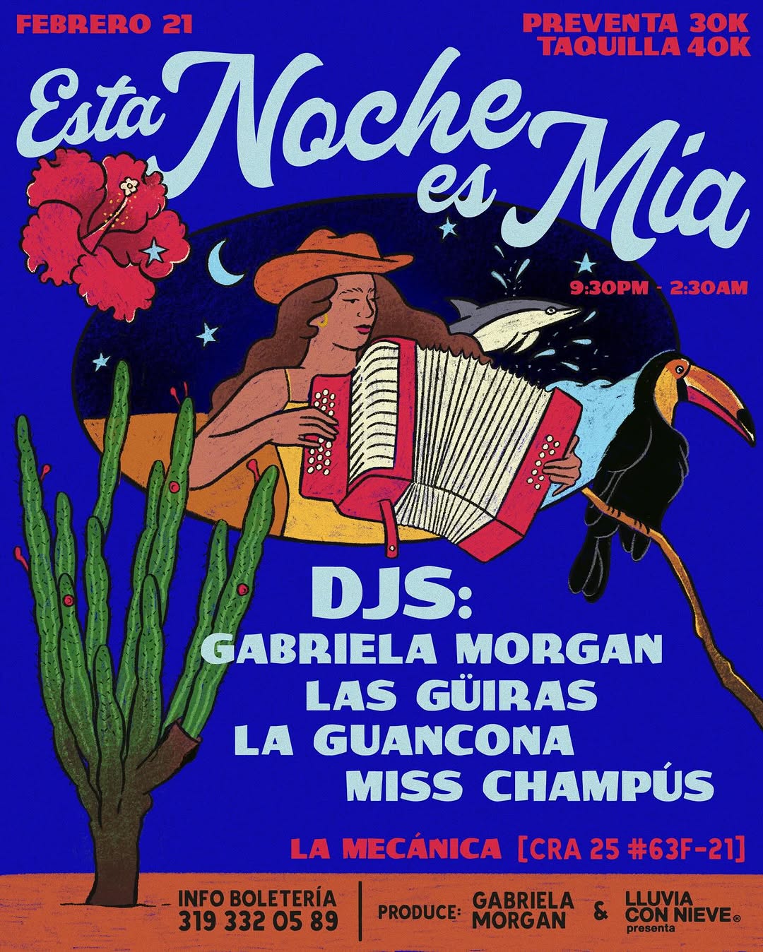 Esta Noche es Mia es una fiesta en Bogotá dedicada al talento femenino en la cabina, con un line up de DJs como Gabriela Morgan, Las Güiras, La Guancona y Miss Champús. En La Mecánica se vivirá una noche de DJ set y clubbing con sonidos diversos y energía intensa, ideal para quienes buscan un plan nocturno diferente en la ciudad. Un evento perfecto para disfrutar, bailar y apoyar a mujeres DJs en la escena local.