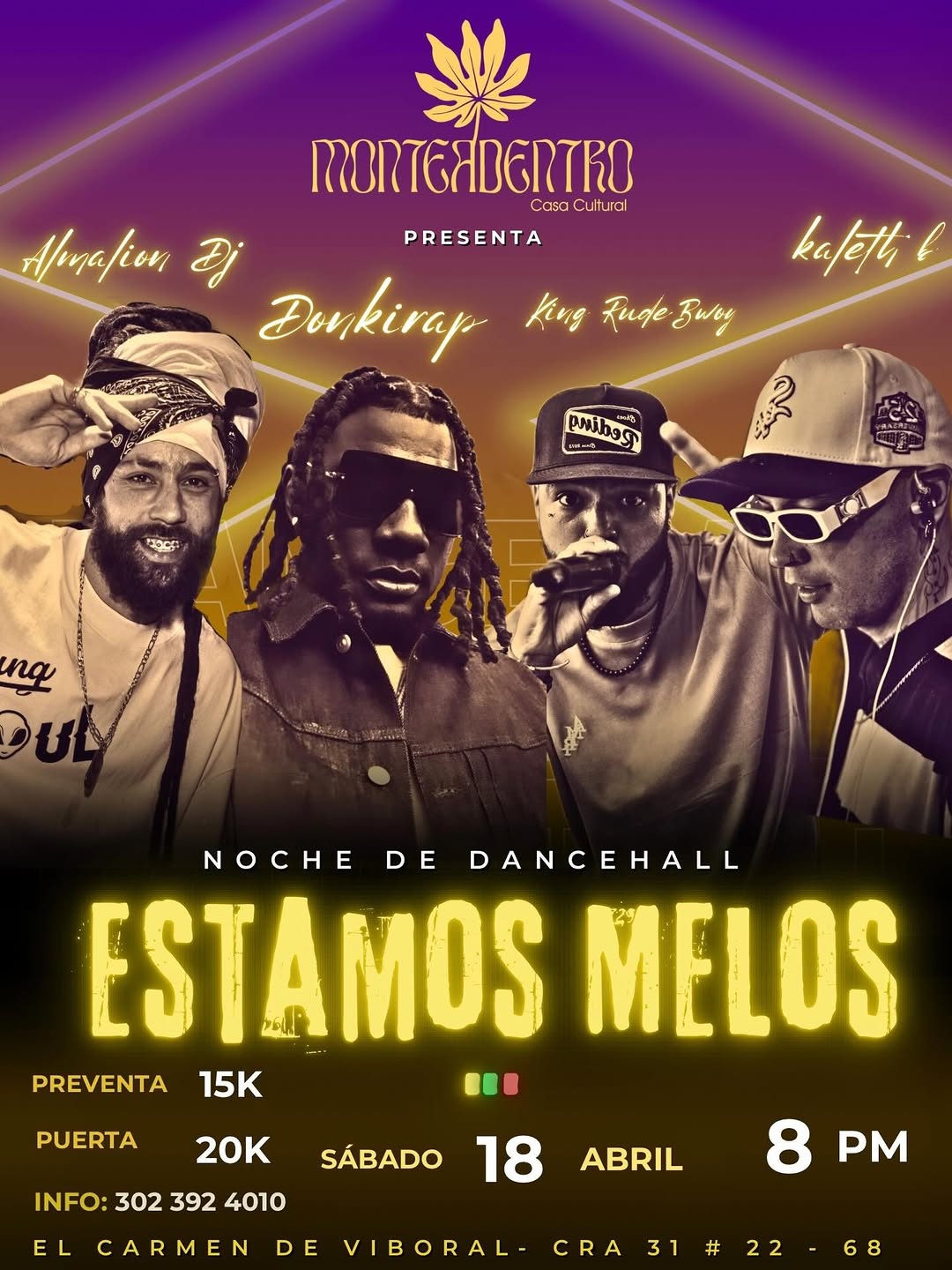 ESTAMOS MELOS – NOCHE DE DANCEHALL es una fiesta dedicada al dancehall en Montcadentro Casa Cultural, en El Carmen de Viboral. La noche reúne a Donkirrap desde el Pacífico, King Rude Bwoy desde Pereira, Kaleth B desde Medellín y Almalion DJ, prometiendo una experiencia intensa de baile y sonidos caribeños. Es un evento ideal para amantes del dancehall que buscan una rumba cercana a la cultura urbana y a los ritmos jamaicanos en el oriente antioqueño.