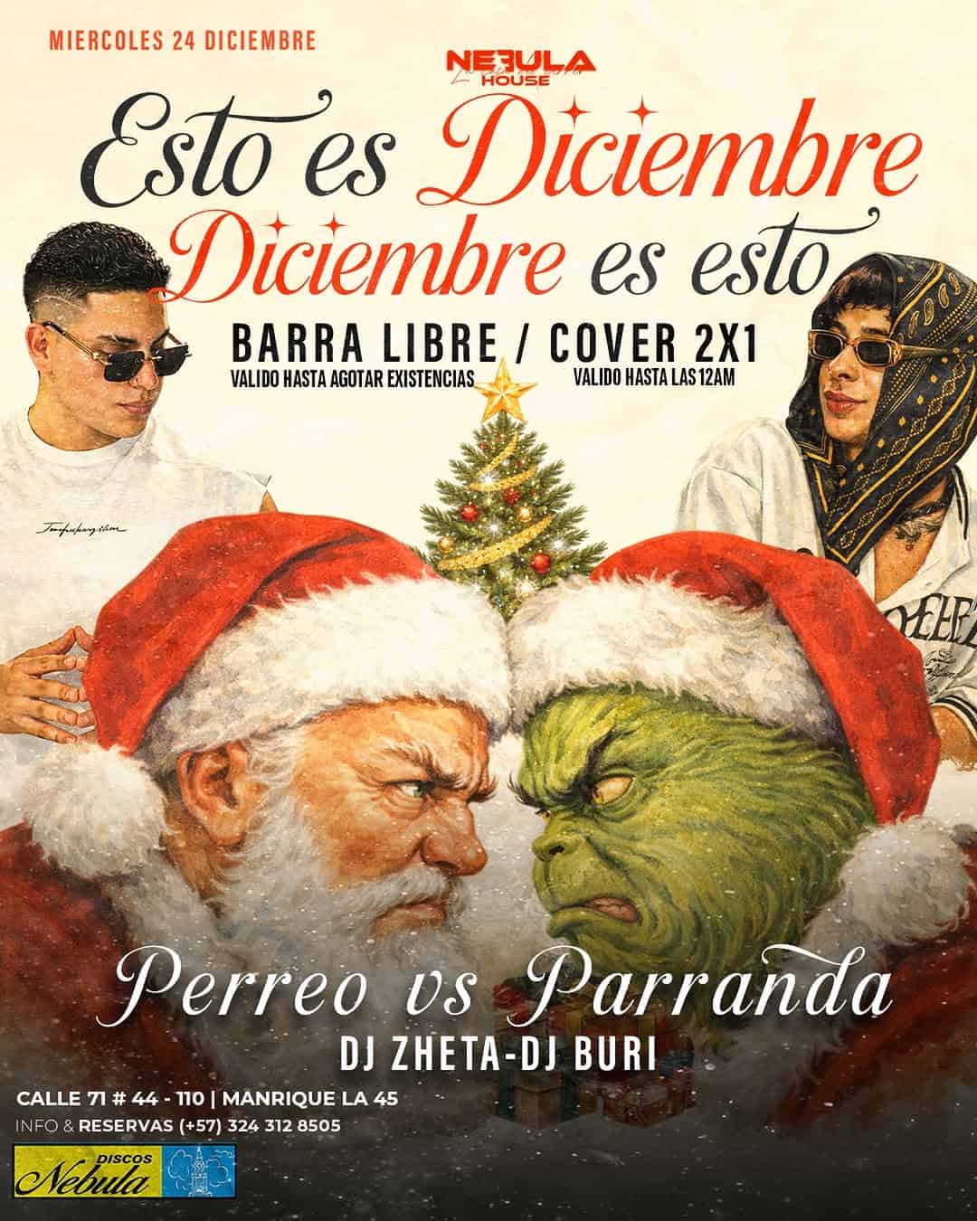Este 24 de Diciembre, Medellín se viste de fiesta con ‘Esto es Diciembre – Diciembre es esto / Perreo vs Parranda’. Un evento navideño temático que promete una noche llena de ritmo y diversión en Nebula House. Los DJs Zheta y Buri serán los encargados de poner a todos a bailar con lo mejor del Perreo y la Música Parrandera. ¡No te lo pierdas!
