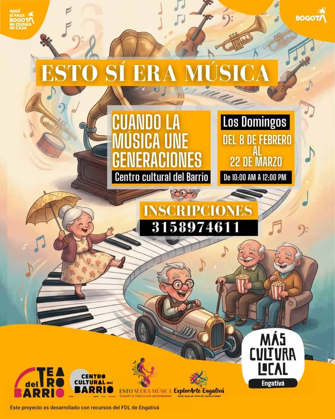 Esto Sí Era Música es un espacio cultural musical intergeneracional en el Centro Cultural del Barrio en Bogotá, donde la música se convierte en puente entre distintas generaciones. Este evento propone una experiencia cercana y comunitaria, ideal para familias y vecinos que quieren compartir recuerdos, canciones y nuevas formas de escuchar. Es una actividad cultural que resalta la memoria musical y la vida de barrio, promoviendo la participación y la cultura local en Engativá.