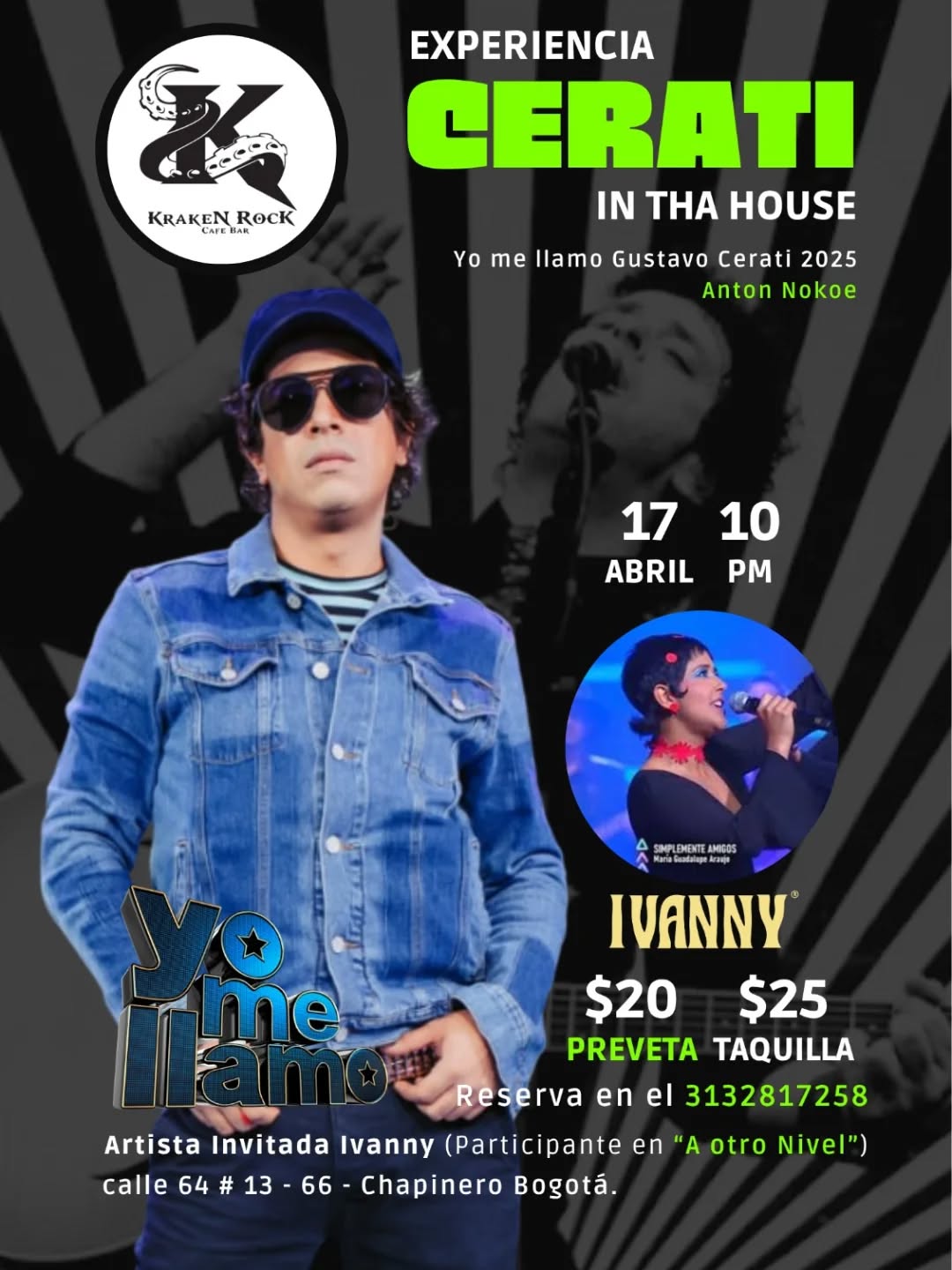 EXPERIENCIA CERATI IN THA HOUSE es un tributo en vivo a la música de Gustavo Cerati y Soda Stereo en formato concierto, con Anton Nokoe y la artista invitada Ivanny, reconocida por su participación en A Otro Nivel. En Kraken Rock Café Bar en Bogotá podrás disfrutar una noche rockera, íntima y nostálgica, ideal para cantar, recordar clásicos y conectarte con los sonidos que marcaron generaciones.