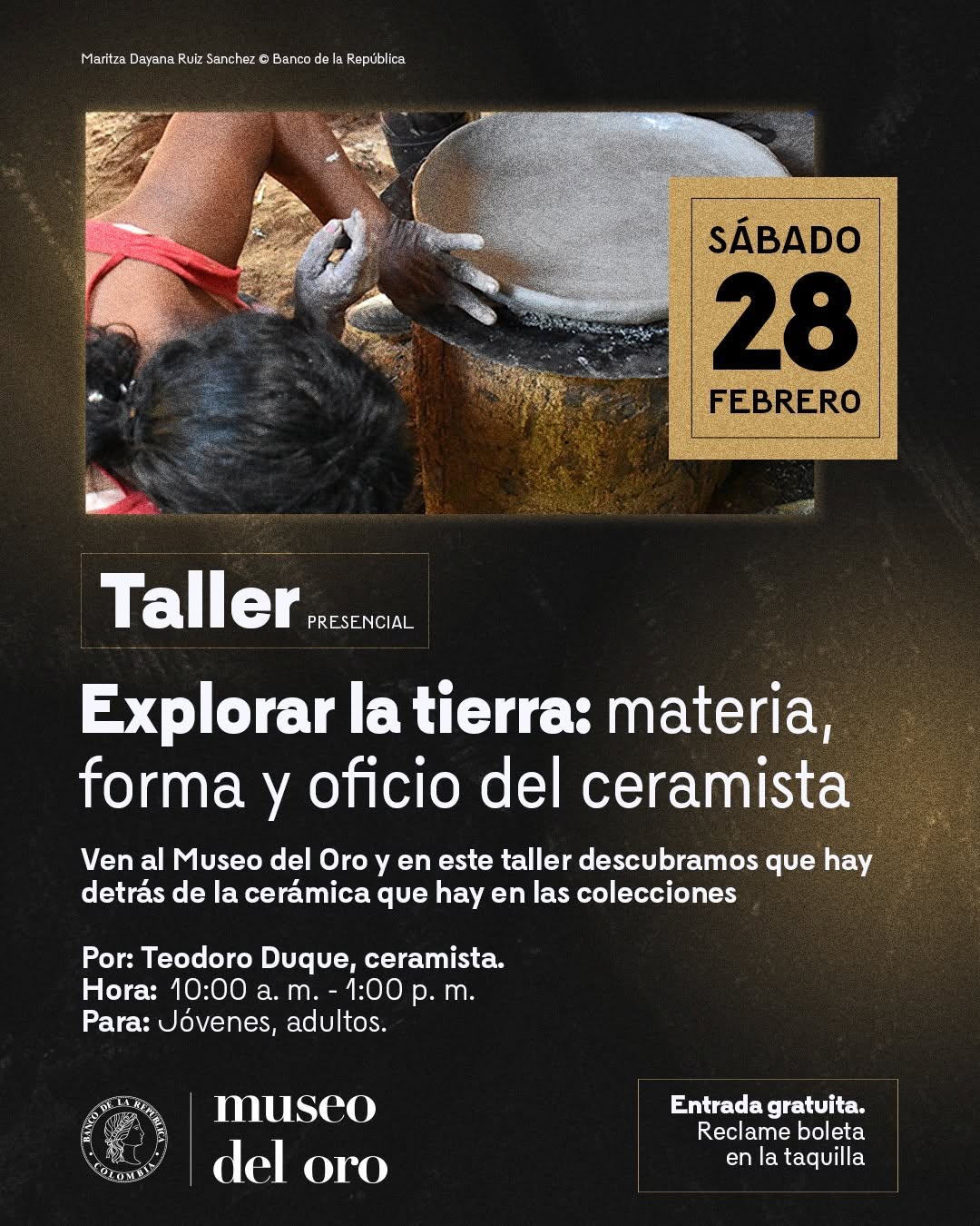 Explorar la tierra: materia, forma y oficio del ceramista es un taller cultural en el Museo del Oro en Bogotá, guiado por el ceramista Teodoro Duque. A través de ejemplos prácticos y ejercicios de observación, las y los participantes conocerán las técnicas cerámicas prehispánicas, los componentes de la pasta cerámica y cómo se combinaban arcillas, arena y otros materiales. Es una experiencia ideal para quienes desean comprender la cerámica desde su materialidad y el oficio del ceramista.