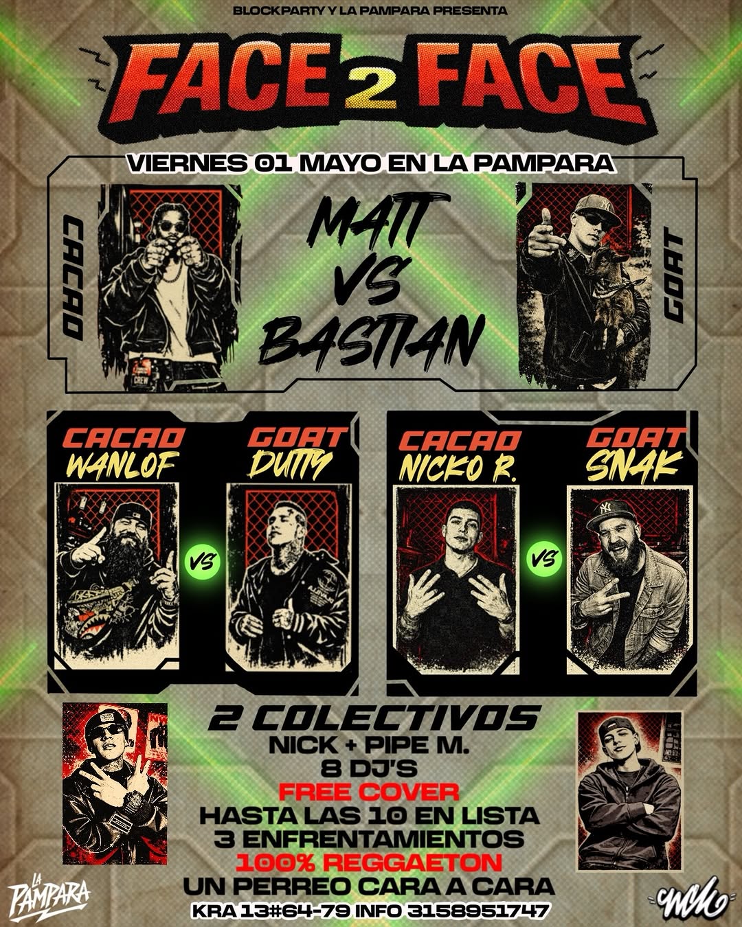 FACE 2 FACE es una fiesta 100% reggaetón en La Pampara, donde dos colectivos se enfrentan en cabina con 8 DJs para un perreo cara a cara. Organizado por Blockparty y La Pampara en Bogotá, este evento promete una noche intensa de reggaetón continuo, mezclas en vivo y energía urbana perfecta para quienes buscan rumba fuerte y competitiva en la ciudad.