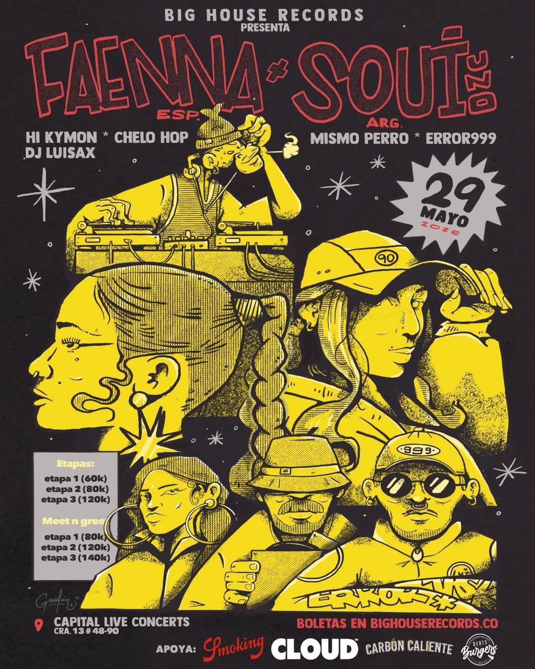 FAENNA SOUL es un concierto de rap y sonidos urbanos que llega a Capital Live Concerts en Bogotá, presentado por Big House Records. En tarima estarán artistas como Faenna, Soui Uno, Chelo Hop, Error999, Mismo Perro, Hi Kymon y DJ Luisax, en una noche dedicada al hip hop y la cultura underground. Un plan ideal para quienes buscan un show en vivo intenso, cercano a los artistas y con la vibra del rap colombiano y latino.