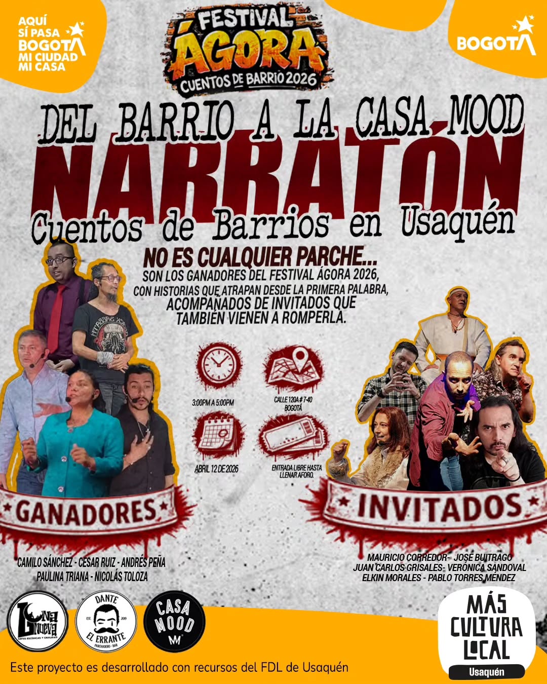 Festival Agora – Cuentos de Barrio 2026 llega con una narratón en Casa Mood, en Bogotá, donde los ganadores del Festival Ágora 2026 comparten cuentos llenos de humor, emoción y cotidianidad barrial. Es un espacio familiar para sentarse a escuchar historias que enganchan desde el inicio, con narradores invitados que mantienen al público atento de principio a fin. Un plan cultural ideal para disfrutar de la narración oral en Usaquén.