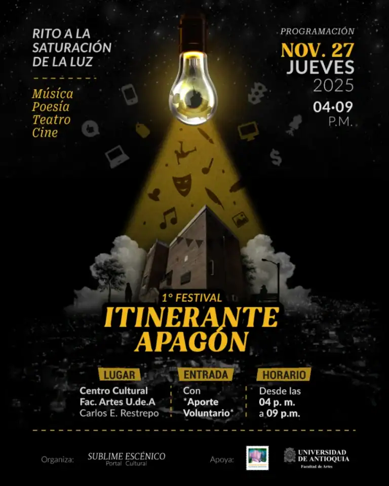 🗓 Jueves 27 de Noviembre / 2025🕝 2:00 p.m. a 9:00 p.m.📍 Centro Cultural Facultad de Artes UdeA📌Cra 64B #51-64, barrio Carlos E. Restrepo🎟 Participación libre con aporte voluntario