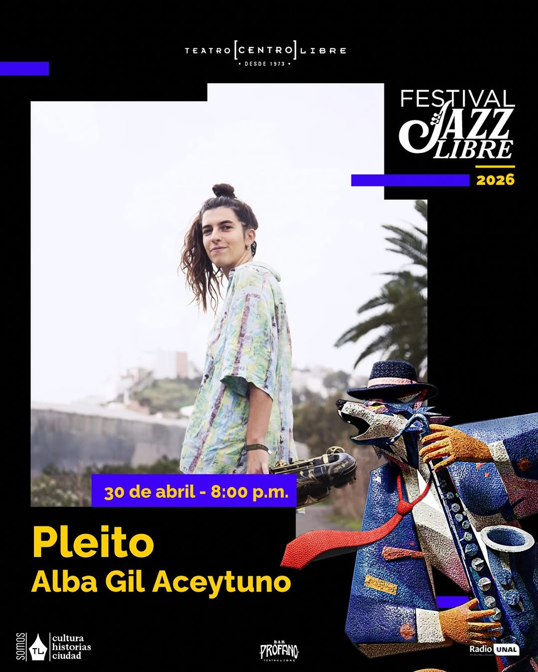 El Festival Jazz Libre 2026 presenta la gira Pleito – Los colores de las piedras de @albatuno en el escenario del Teatro Libre, en Bogotá. Será una noche dedicada al jazz contemporáneo, donde la propuesta de Alba Gil Aceytuno invita a explorar nuevas sonoridades y matices. Un plan ideal para quienes buscan una experiencia musical en vivo íntima, creativa y de alta calidad dentro de la escena jazzística de la ciudad.