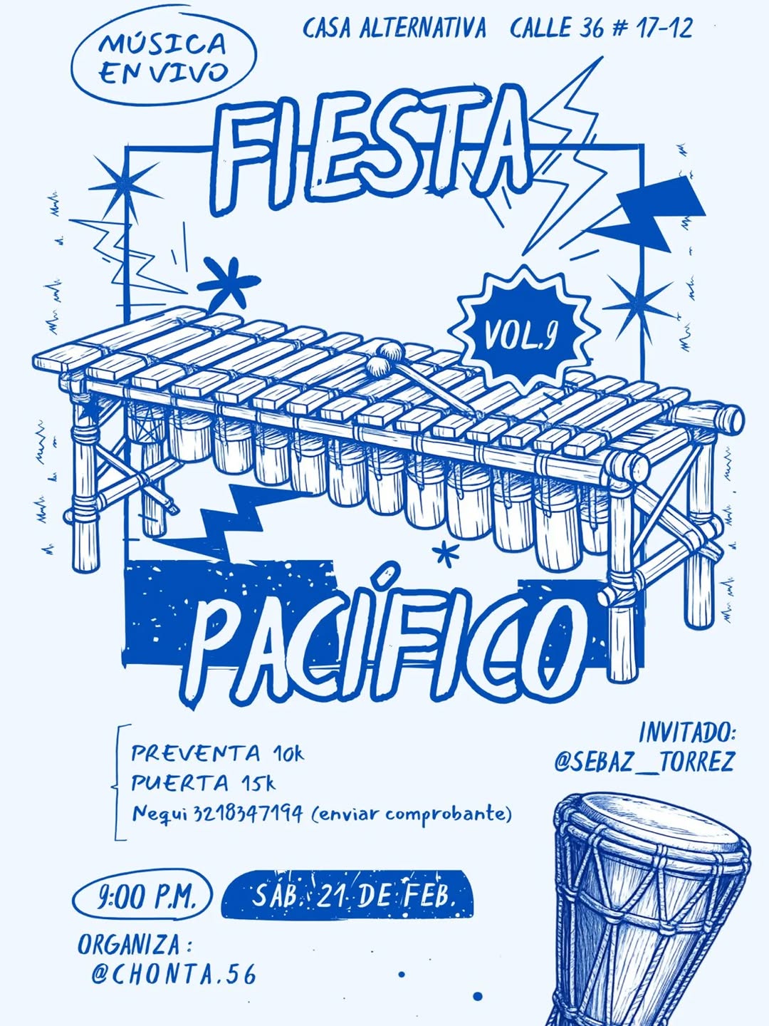 Fiesta Pacífico Vol.9 es una celebración de música del Pacífico colombiano con música en vivo en Casa Alternativa, ideal para quienes buscan una noche de sonidos tradicionales y energía festiva en la ciudad. Con la participación de @sebaz_torrez y la curaduría de @chonta.56, este evento ofrece una experiencia íntima y auténtica, perfecta para disfrutar ritmos afrocolombianos, baile espontáneo y un ambiente cultural diverso en un espacio alternativo.