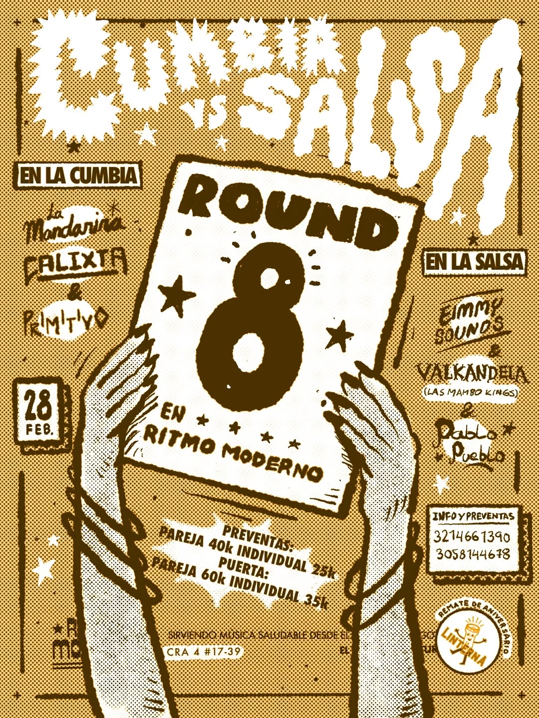 Fiesta Salsa presenta el Round 8 de Cumbia vs Salsa en Ritmo Moderno, una noche de baile en Bogotá donde la cumbia y la salsa se enfrentan en la pista. Con propuestas musicales de La Mandarina, Al Primitivo y Las Mambo Kings, además de anfitriones y DJs invitados, el evento promete un ambiente intenso y festivo para amantes del baile latino. Una experiencia ideal para quienes buscan una rumba dedicada a la salsa y la cumbia en la ciudad.