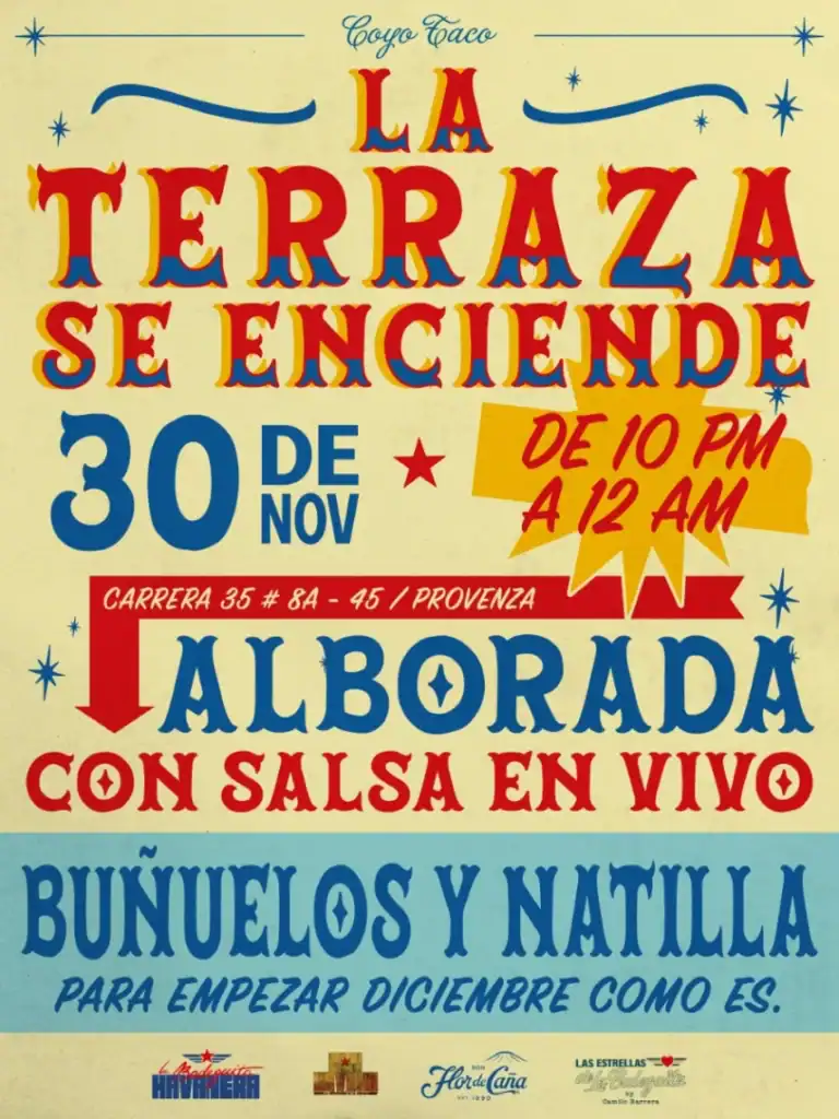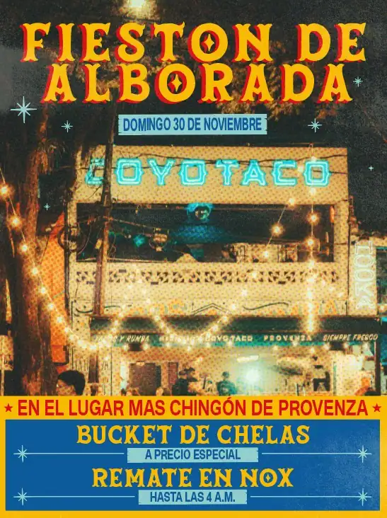 Este 30 de noviembre la terraza se enciende con salsa en vivo, buena vibra y sabor decembrino. Desde las 10 PM hasta medianoche celebramos la llegada de diciembre como es: buñuelos, natilla y rumba latina en el lugar más chingón de Provenza. Y después, seguimos el fiestón con bucket de chelas a precio especial y remate en NOX hasta las 4 AM.