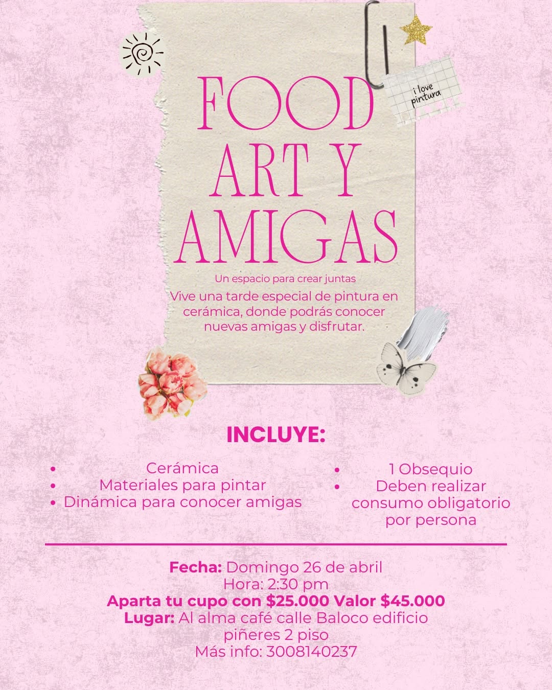 FOOD ART Y AMIGAS es un taller de pintura en cerámica pensado para mujeres que quieren compartir una tarde creativa en Cartagena. En este espacio en Al alma café podrás explorar tu lado artístico, relajarte mientras pintas piezas en cerámica y conectar con nuevas amigas en un ambiente cercano y acogedor. Ideal para quienes buscan un plan diferente, creativo y social en la ciudad.
