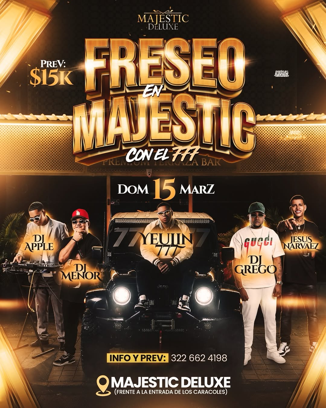 Freseo en Majestic con el FFF es una fiesta urbana en Majestic Deluxe, ideal para quienes buscan una noche de perreo y reguetón en Cartagena. El evento reúne al artista del momento Yeliin junto a DJ Apple, DJ Menor, DJ Grego y Jesus Narvaez, prometiendo un show lleno de energía, sorpresas y mucha rumba. Una experiencia de clubbing perfecta para disfrutar con amigos y vivir la noche cartagenera al máximo.