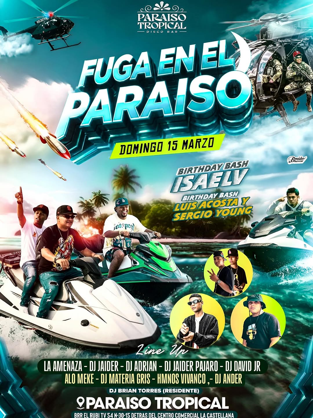 FUGA EN EL PARAISO es un Birthday Bash de alta energía en Paraíso Tropical en Cartagena, donde se celebran los cumpleaños de Isael V, Luis Acosta y Sergio Young con una noche de perreo y rumba intensa. El line up reúne a La Amenaza, varios DJs invitados y el residente Brian Torres para un DJ set / clubbing que promete fiesta continua, ambiente encendido y música urbana hasta el amanecer.