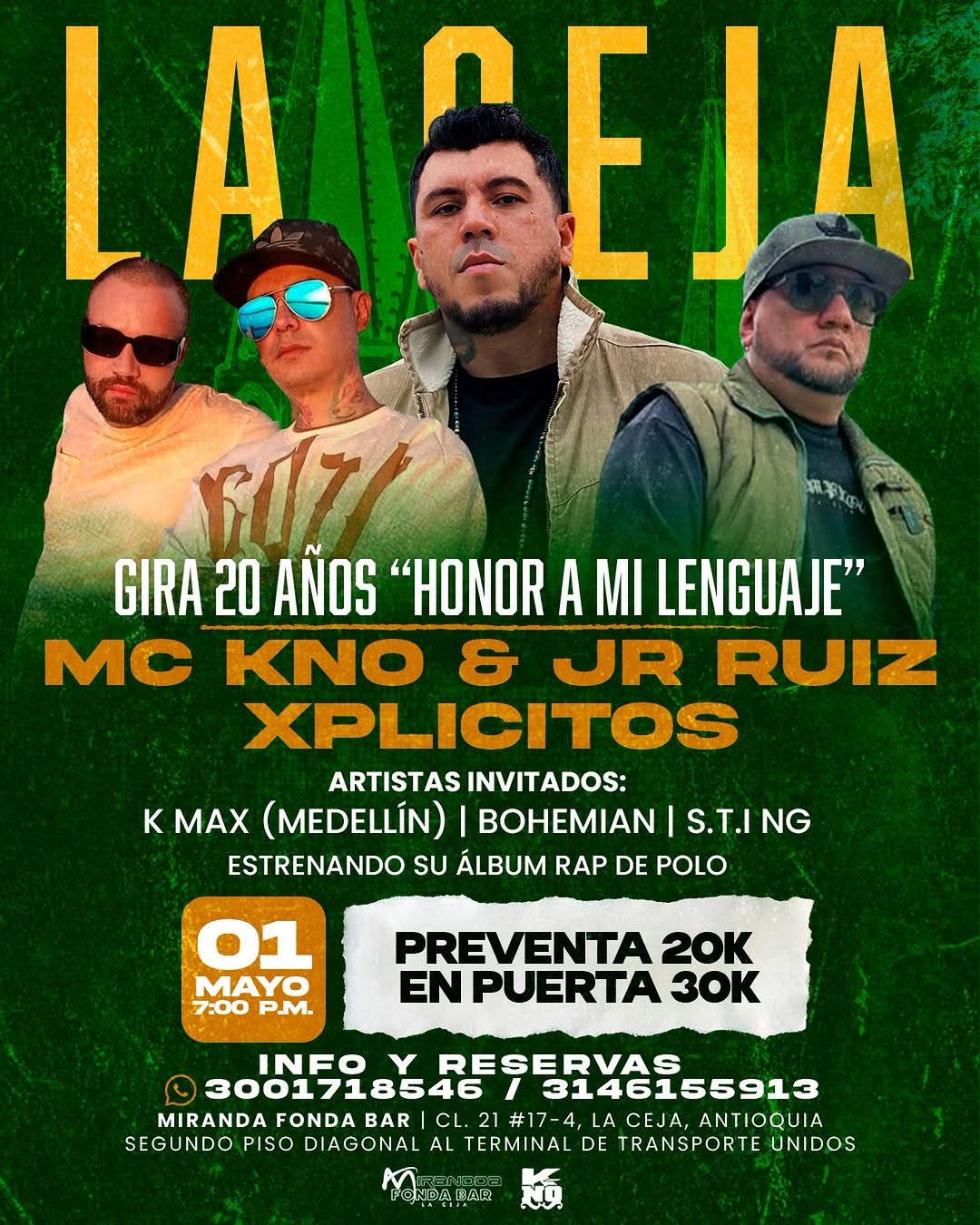 GIRA 20 AÑOS HONOR A MI LENGUAJE llega a Miranda Fonda Bar en La Ceja con una noche dedicada al rap colombiano. MC KNO celebra dos décadas de trayectoria y presenta su álbum “Rap de Polo”, acompañado por JR Ruiz, Xplicitos, K Max, Bohemian y S.T.I NG. Será un concierto íntimo y potente para los amantes del hip hop, ideal para disfrutar letras conscientes, beats clásicos y la energía de la escena rap en Antioquia.