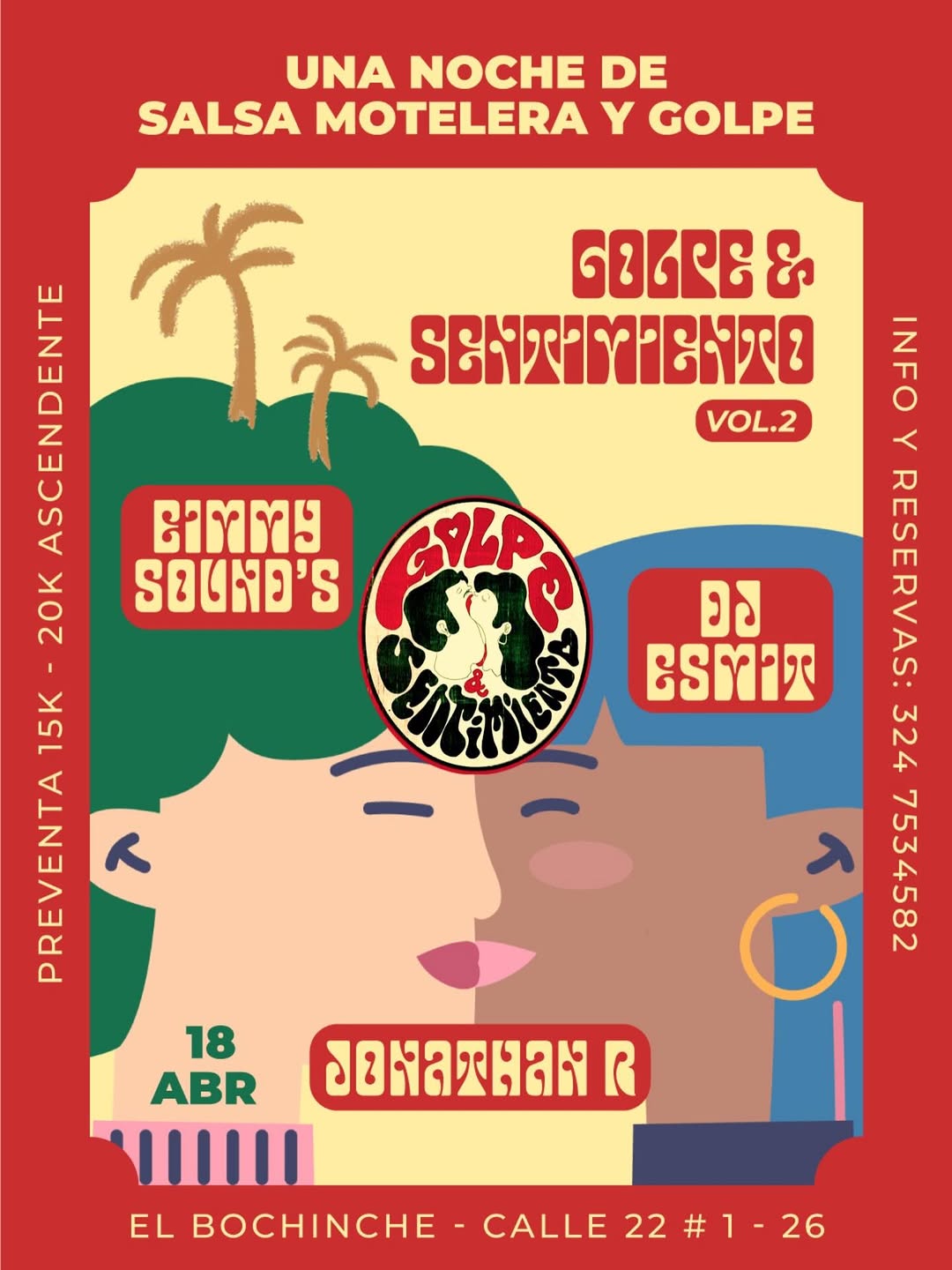Golpe & Sentimiento Vol. 2 es una noche dedicada a la salsa motelera y el golpe, con un ambiente íntimo y bailable en El Bochinche en Bogotá. Eimmy Sound’s, Dj Esmit y Jonathan R se encargan de un viaje entre vinilos y sonidos digitales para amantes de la salsa. Un plan ideal para quienes buscan una velada salsera cargada de sentimiento, sabor y buena música en vivo en la ciudad.