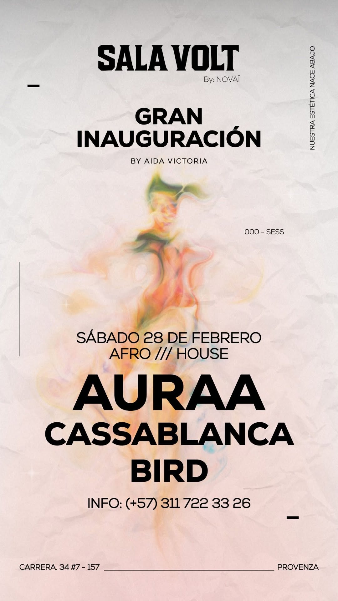 GRAN INAUGURACIÓN de la Sala Volt en Medellín, un evento de música Afro y House que reúne a los DJs Auraa, Cassablanca y Bird en un ambiente íntimo y clubero en Provenza. Esta sesión promete ritmos electrónicos envolventes, energía alta y una experiencia ideal para amantes del clubbing en la ciudad, con un enfoque en sonidos afrohouse y una curaduría musical pensada para bailar toda la noche.