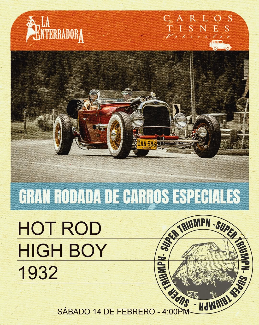 Gran Rodada de Carros Especiales es una rodada de carros clásicos y especiales en La Enterradora, destacando un Hot Rod High Boy 1932. Este encuentro automotriz en Carlos Tisnes reúne aficionados a los vehículos antiguos y personalizados, ideal para tomar fotos, compartir entre amantes de los motores y disfrutar de una exhibición única. Un plan perfecto para quienes buscan un evento diferente alrededor de los carros en la ciudad.
