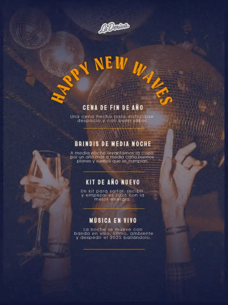 HAPPY NEW WAVES 2026 en La Deriva, es la forma más fresca de despedir el año en La Deriva. Una noche vibrante con cena especial, música en vivo y un brindis de medianoche para recibir el 2026 con buenas olas y mejor energía. Sumérgete en un ambiente cálido, festivo y lleno de sabor, acompañado de un cóctel de bienvenida y un kit de Año Nuevo diseñado para empezar el nuevo ciclo con la mejor vibra.