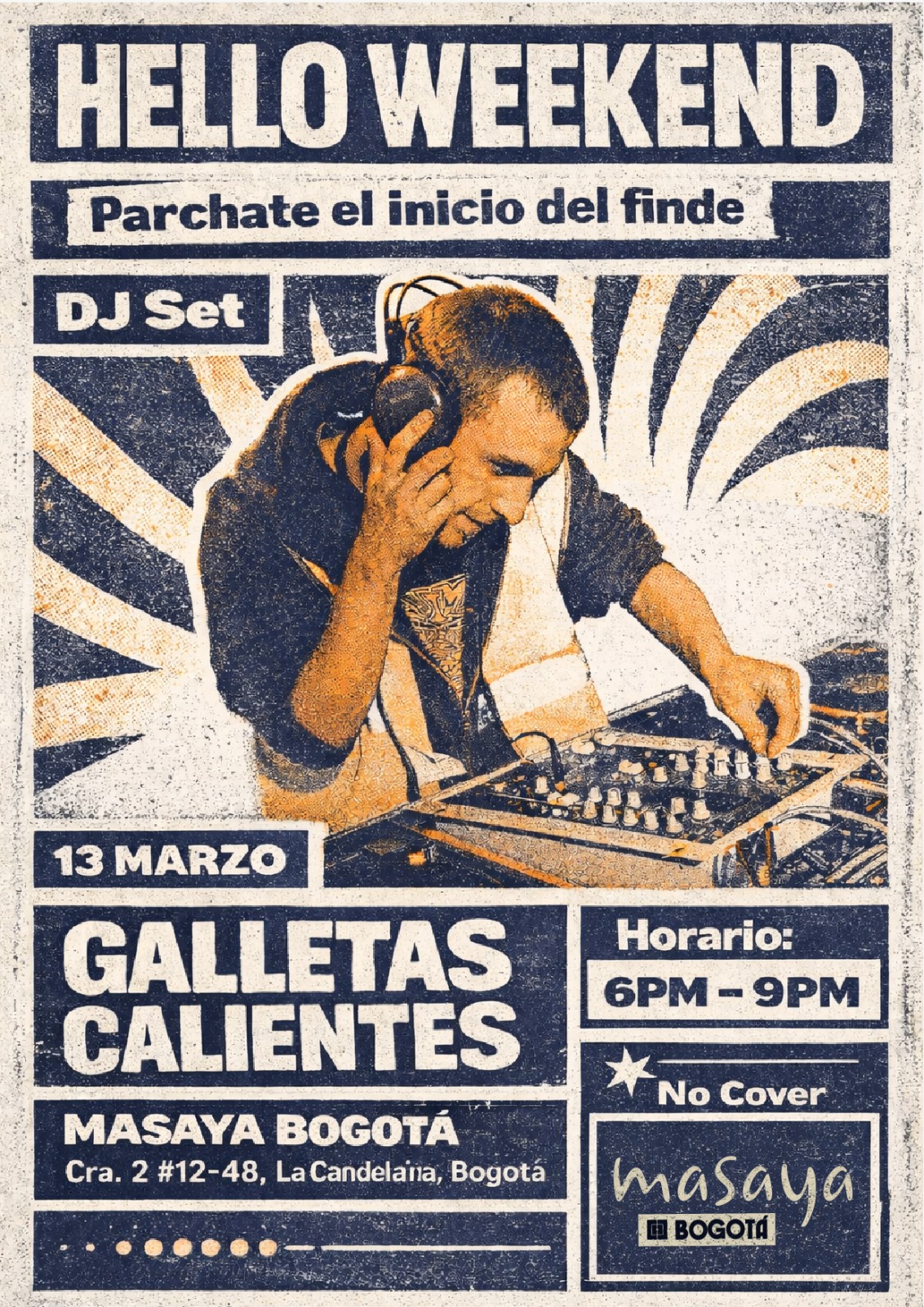 El próximo 13 de marzo de 2026, Bogotá se llena de ritmo con el evento HELLO WEEKEND, un vibrante DJ set que promete activar tus sentidos desde las 6:00 p.m. hasta las 9:00 p.m. Este encuentro musical ofrece una experiencia única para quienes disfrutan de la música electrónica y la energía de un buen ambiente nocturno. Ubicado en un espacio ideal para disfrutar del mejor sonido y la compañía de otros amantes del género, HELLO WEEKEND es la oportunidad perfecta para desconectarte y sumergirte en una noche llena de beats envolventes y buena vibra. Prepárate para vivir un evento que resalta la escena musical de Bogotá y te invita a celebrar la música desde el atardecer hasta la noche.