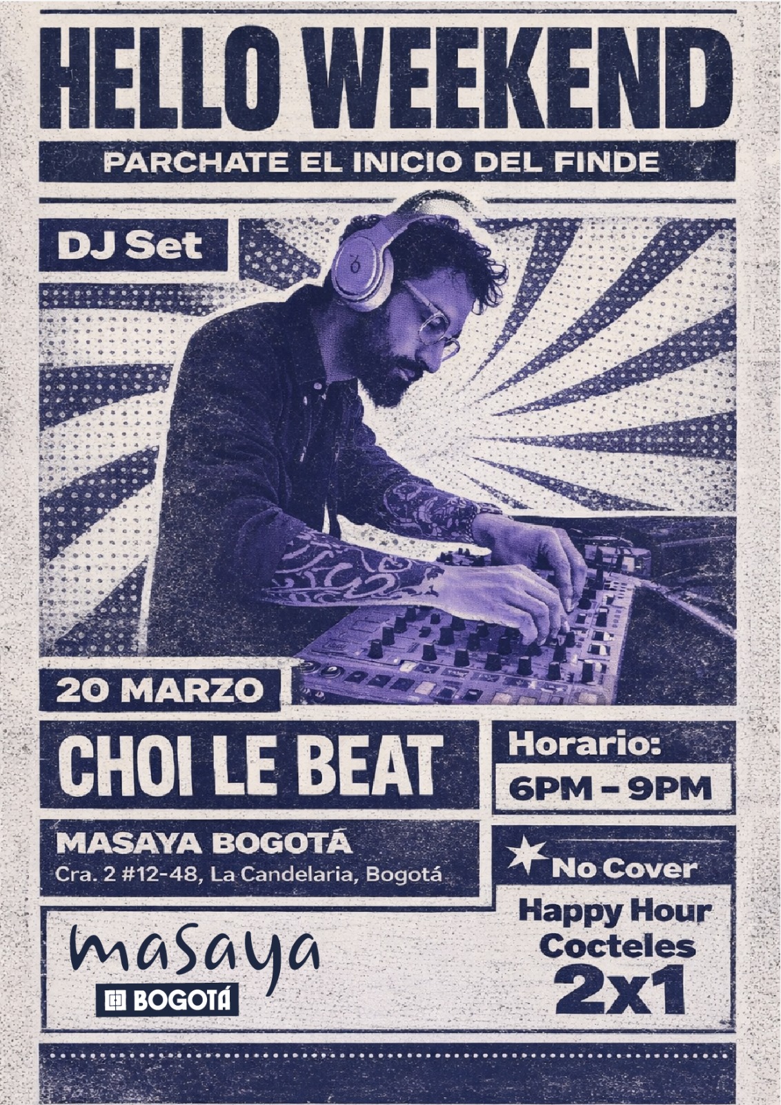 El próximo 20 de marzo de 2026, Bogotá vibrará con el evento HELLO WEEKEND, un DJ set que promete llenar de energía la ciudad desde las 6:00 p.m. hasta las 9:00 p.m. Esta experiencia musical está diseñada para quienes disfrutan de ritmos envolventes y ambientes llenos de buena vibra, perfectos para comenzar el fin de semana con ánimo renovado. En un espacio ideal para conectar con amigos y dejarse llevar por la música, HELLO WEEKEND invita a todos a vivir una noche cargada de sonidos que inspiran movimiento y diversión. Si buscas un plan diferente que combine música electrónica y una atmósfera dinámica, esta cita en Bogotá será una oportunidad para compartir y disfrutar al máximo.