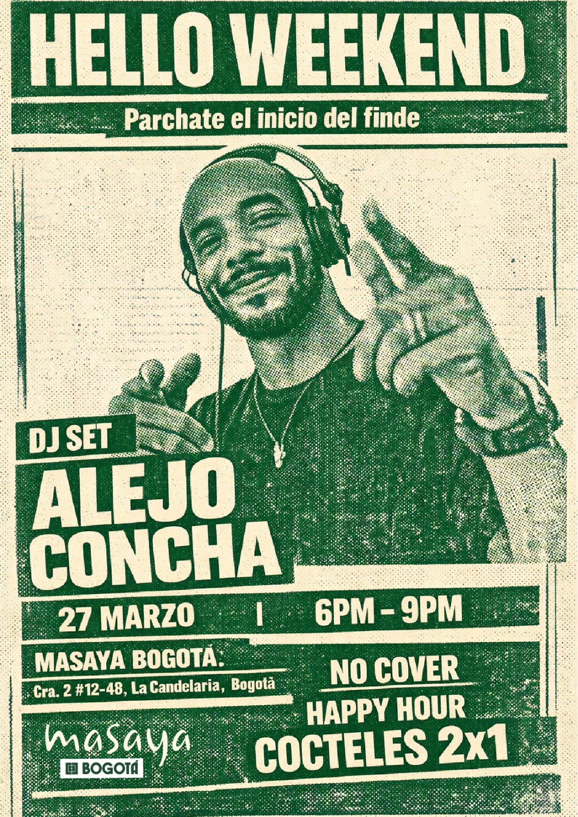 HELLO WEEKEND llega a Bogotá con una propuesta de música electrónica que invita a disfrutar de una noche vibrante y llena de energía. Este DJ set promete mantener el ritmo y la emoción hasta el final, en un ambiente perfecto para compartir con amigos y vivir una experiencia única. Además, podrás aprovechar la promoción de cocteles 2×1, ideal para brindar y relajarte mientras la música te envuelve. Si buscas una salida animada en la ciudad, este evento es una opción perfecta para conectar con la escena musical local y disfrutar de momentos inolvidables.