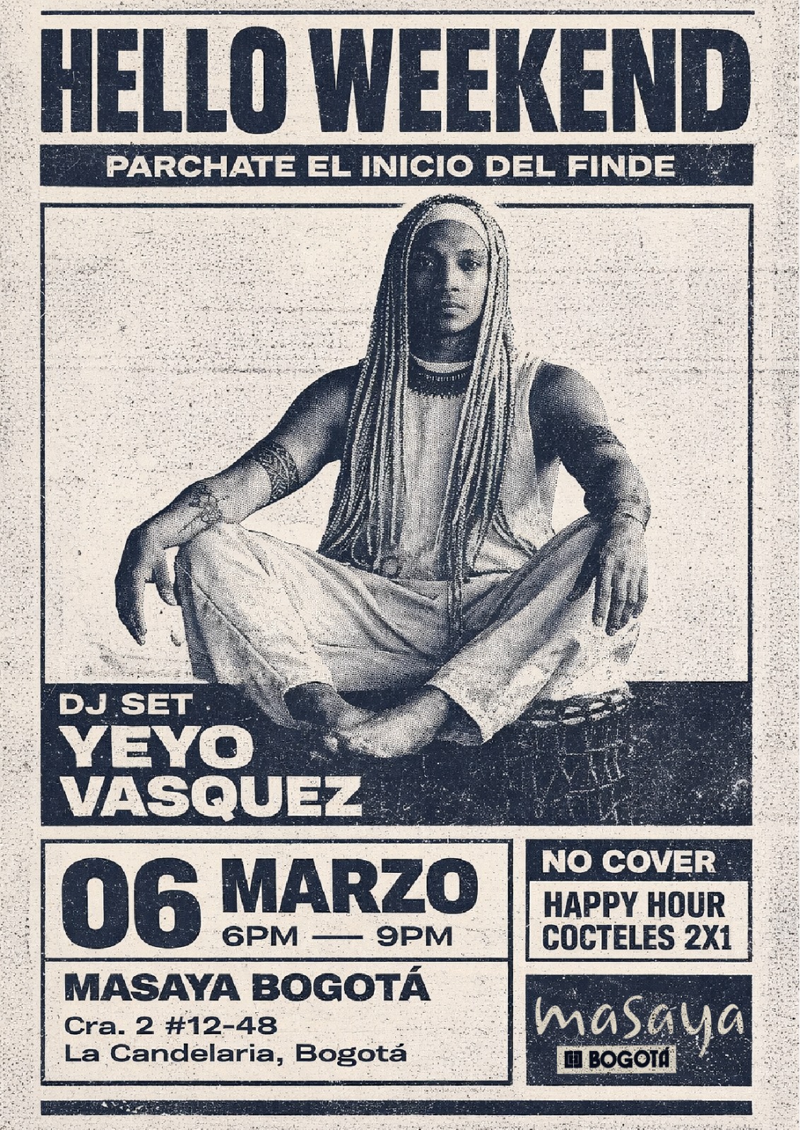 Arranca el fin de semana con la mejor energía en Masaya Bogotá. Disfruta un DJ set en vivo con una mezcla perfecta para prender el ambiente, compartir con viajeros y locales, y comenzar el finde como se debe.