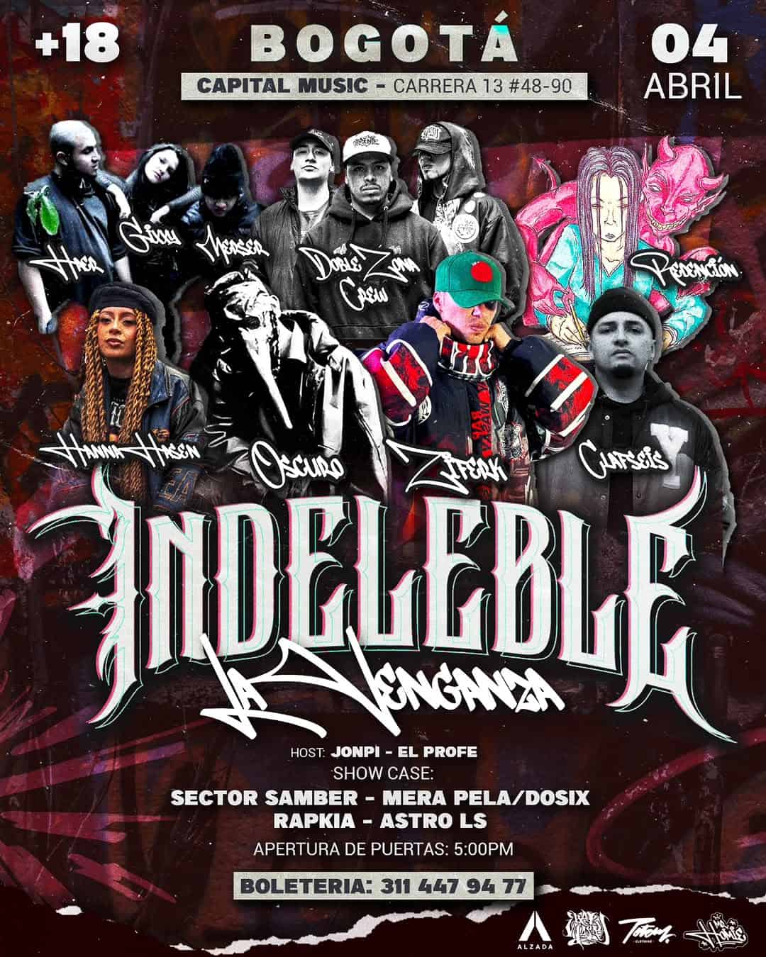 Prepárate para una noche inolvidable de Hip Hop/Rap en Bogotá. INDELEBLE LA VENGANZA reúne a artistas legendarios de la escena en un concierto que promete ser épico. Con la participación de Jheal, Sizu, Verssa, Dani, Capu Crew, Percepción, Hamir Hasan, Oscuro, Ztrack, Cloners, JONPI – EL PROFE, SECTOR SAMBER, MERA PELA/DOSIX, RAPKIA, ASTRO LS y más. Este no es solo un evento, es una advertencia. ¡No te lo puedes perder!