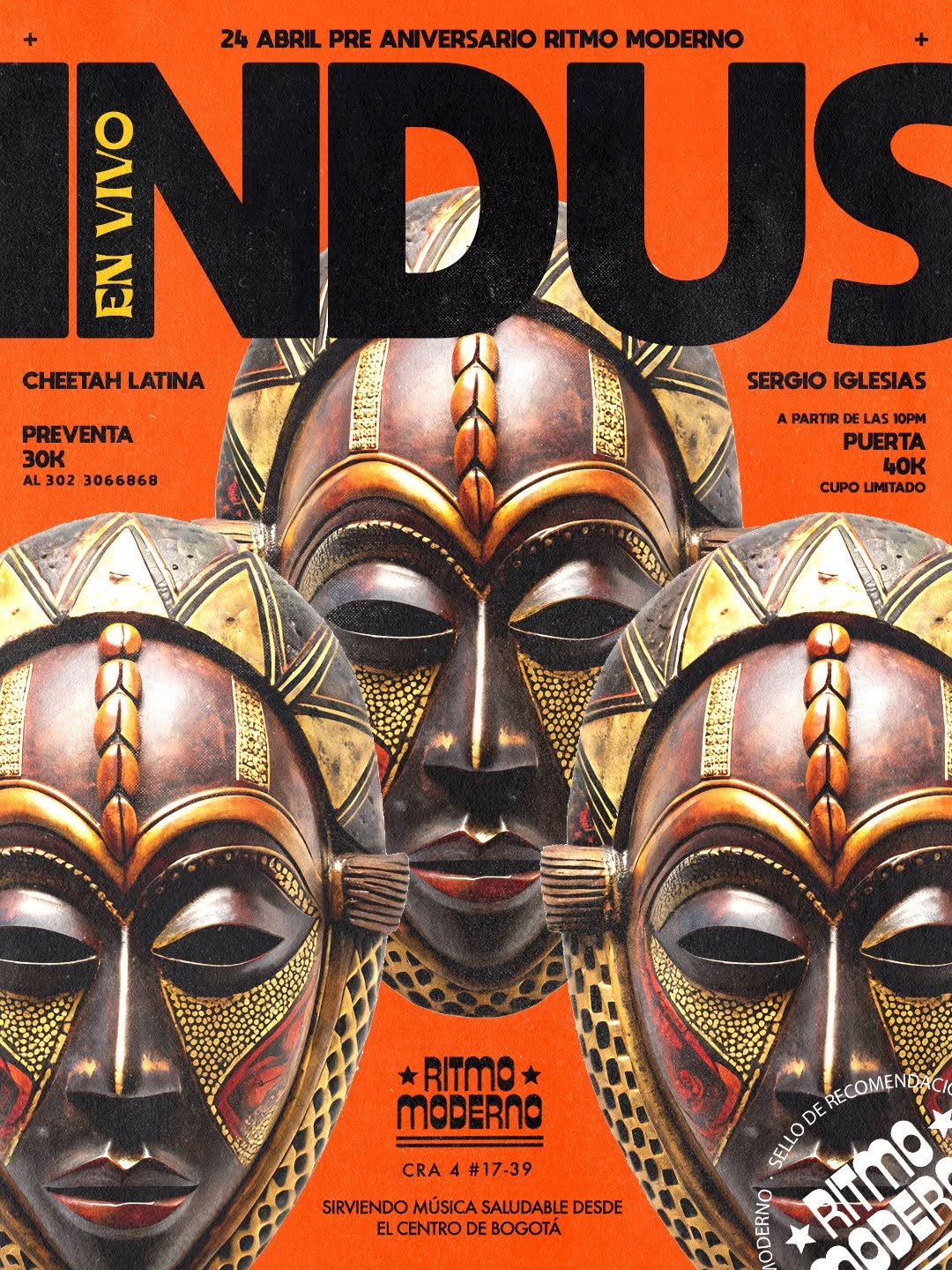 INDUS EN VIVO llega a Ritmo Moderno en Bogotá con un ritual sonoro que mezcla síntesis análoga, percusión en vivo y ritmos afrocolombianos en un viaje hipnótico para la pista. Este evento de pre aniversario de Ritmo Moderno contará también con la energía de Cheetah Latina y Sergio Iglesias, en una noche intensa y envolvente que conecta lo ancestral con el pulso contemporáneo del club, ideal para amantes de la música electrónica y la escena local.