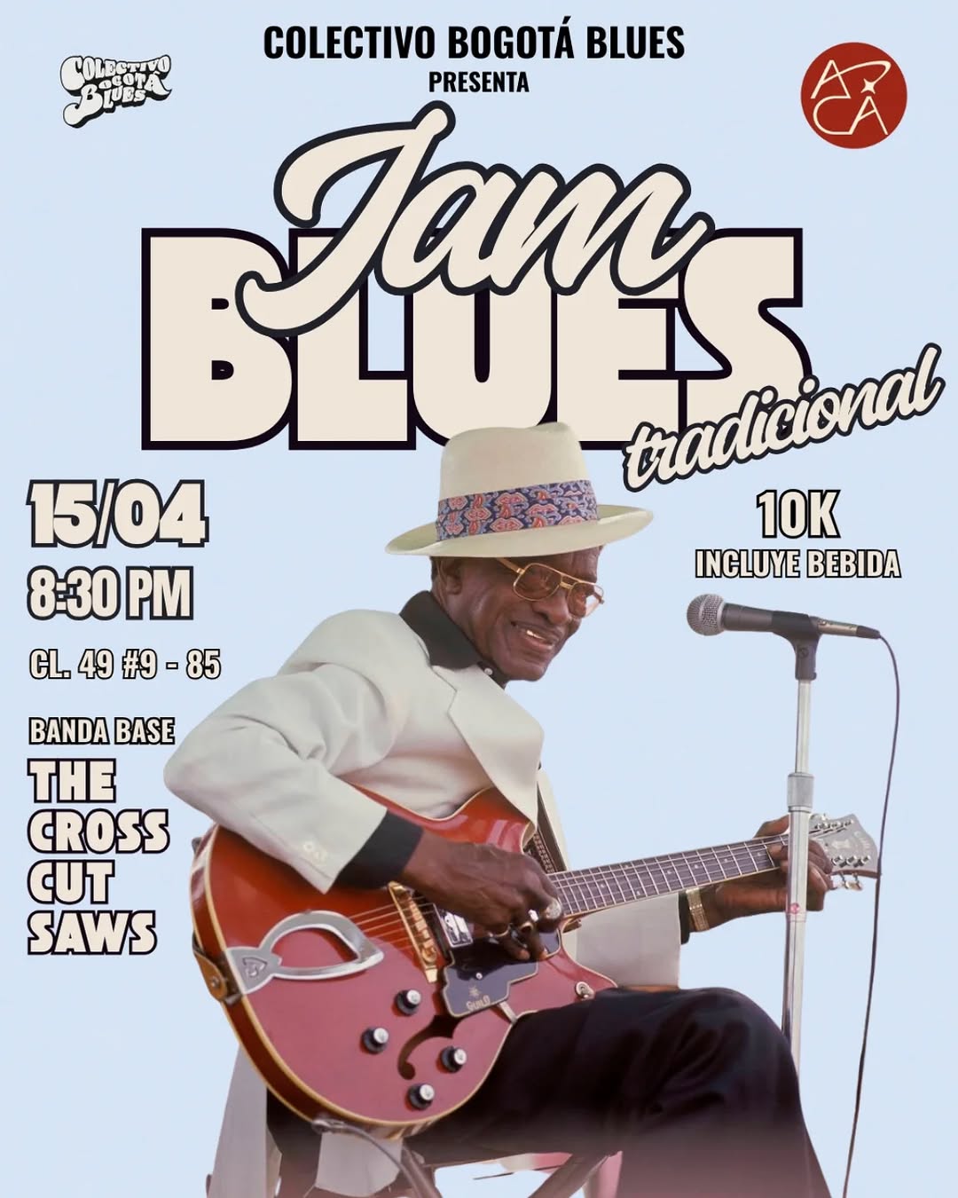 Jam Blues tradicional es la cuarta edición del jam de blues del Colectivo Bogotá Blues en Bogotá, un espacio para músicos y amantes del blues tradicional. Con apertura acústica de Andrés Osorio y Jean Pierre Moreno y la banda base The Cross Cut Saws, el público puede inscribirse al llegar y subir a tocar. Es una noche dedicada a los clásicos del blues, honrando sus raíces afroamericanas y rindiendo tributo a los grandes maestros del género.