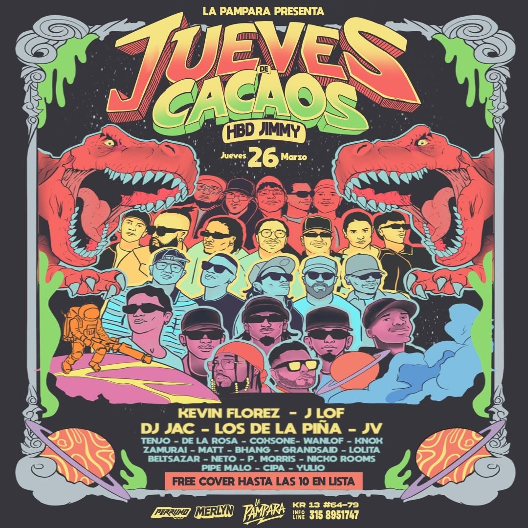 Jueves de Cacaos HBD Jimmy es una fiesta de clubbing en La PáMpara que celebra el cumpleaños de uno de los cacaos de la casa con tres stages y un cartel lleno de talento urbano y tropical. El evento reúne a Kevin Flórez, DJ Jac, Los de la Piña, J Lof y el Team Cacao, para una noche de perreo, dancehall y ritmos caribeños ideal para quienes buscan rumba intensa en Bogotá.
