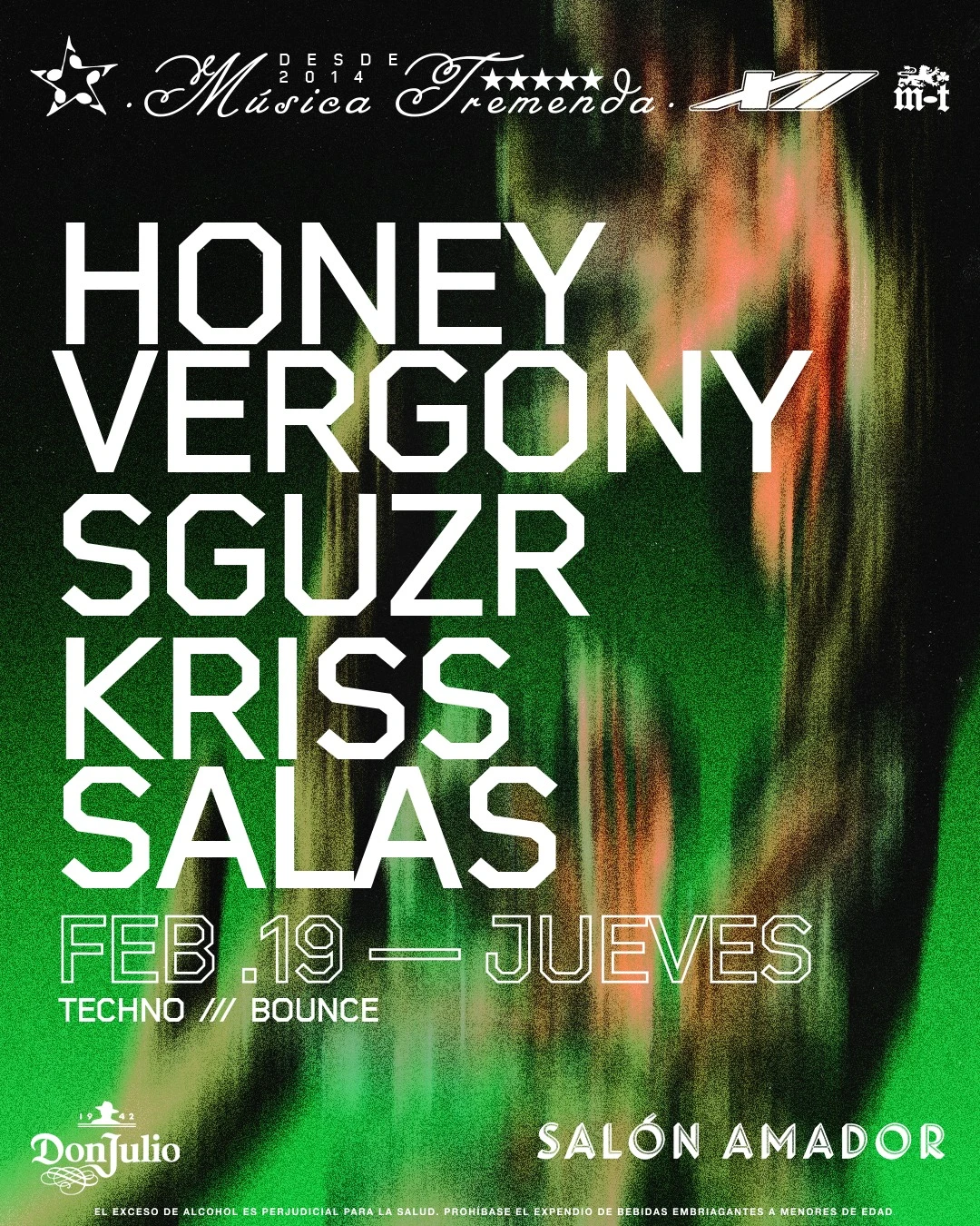 Noche tremenda de techno y bounce con KRISS SALAS, SGUZR y HONEY VERGONY. Sonido contundente y alta energía para abrir el fin de semana como se debe.