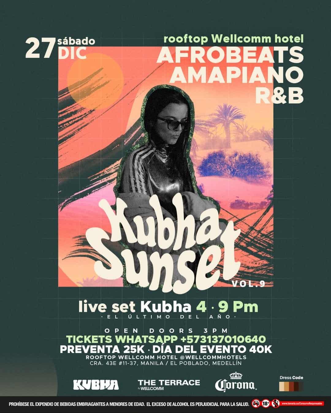 Despide el año con estilo en la versión #9 de Kubha Sunset, uno de los eventos más esperados en Medellín. Disfruta de una tarde llena de ritmo con la selekta de afrobeats, amapiano y R&B a cargo del DJ Kubha. Este evento se llevará a cabo en el rooftop del Hotel Wellcomm, un lugar que nos ofrece una vista espectacular de la ciudad. No te pierdas este increíble sunset party, ¡te esperamos!
