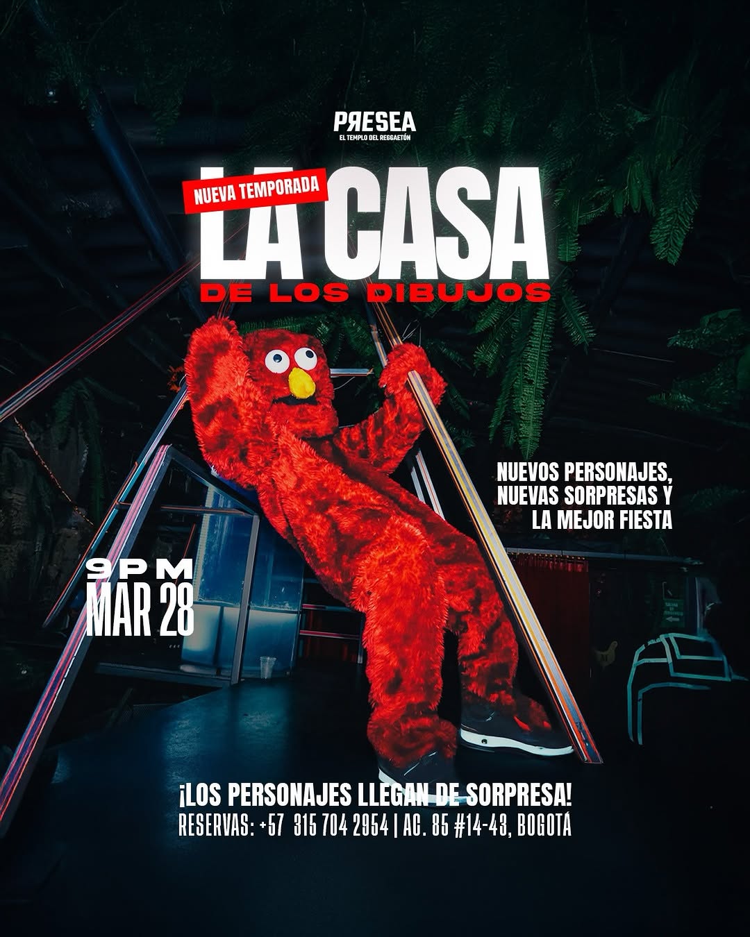 La Casa de los Dibujos Vol. 2 es una fiesta de reggaetón en Presea Rooftop en Bogotá, donde el Templo del reggaetón presenta una nueva temporada con personajes sorpresa, más perreo y una energía más intensa que la primera edición. Es una experiencia de clubbing pensada para bailar sin parar, disfrutar tragos con amigos y vivir una noche temática llena de flow, sorpresas y ambiente urbano.