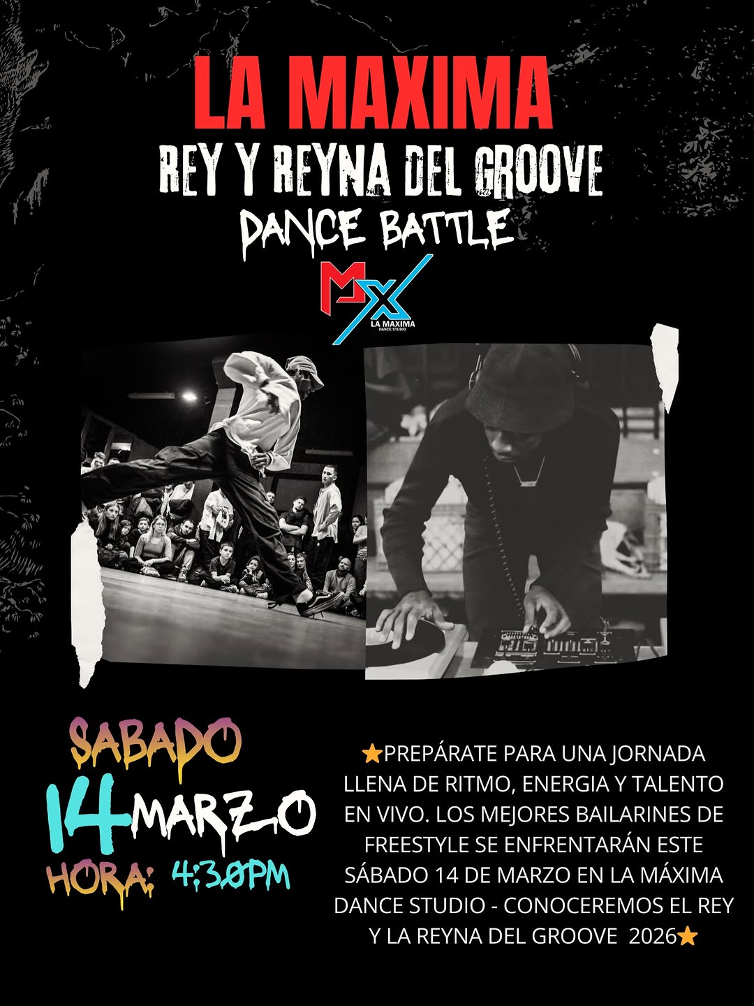 Rey y Reyna del Groove es una batalla de baile all style donde los mejores freestylers se enfrentan para coronarse como la máxima figura del groove en 2026. Este evento de dance battle en La Máxima Dance Studio en Cartagena promete una jornada intensa de ritmo, actitud, competencia y premios, con mucha música y energía urbana. Ideal para bailarines y amantes del baile que buscan una experiencia vibrante y competitiva en la ciudad.