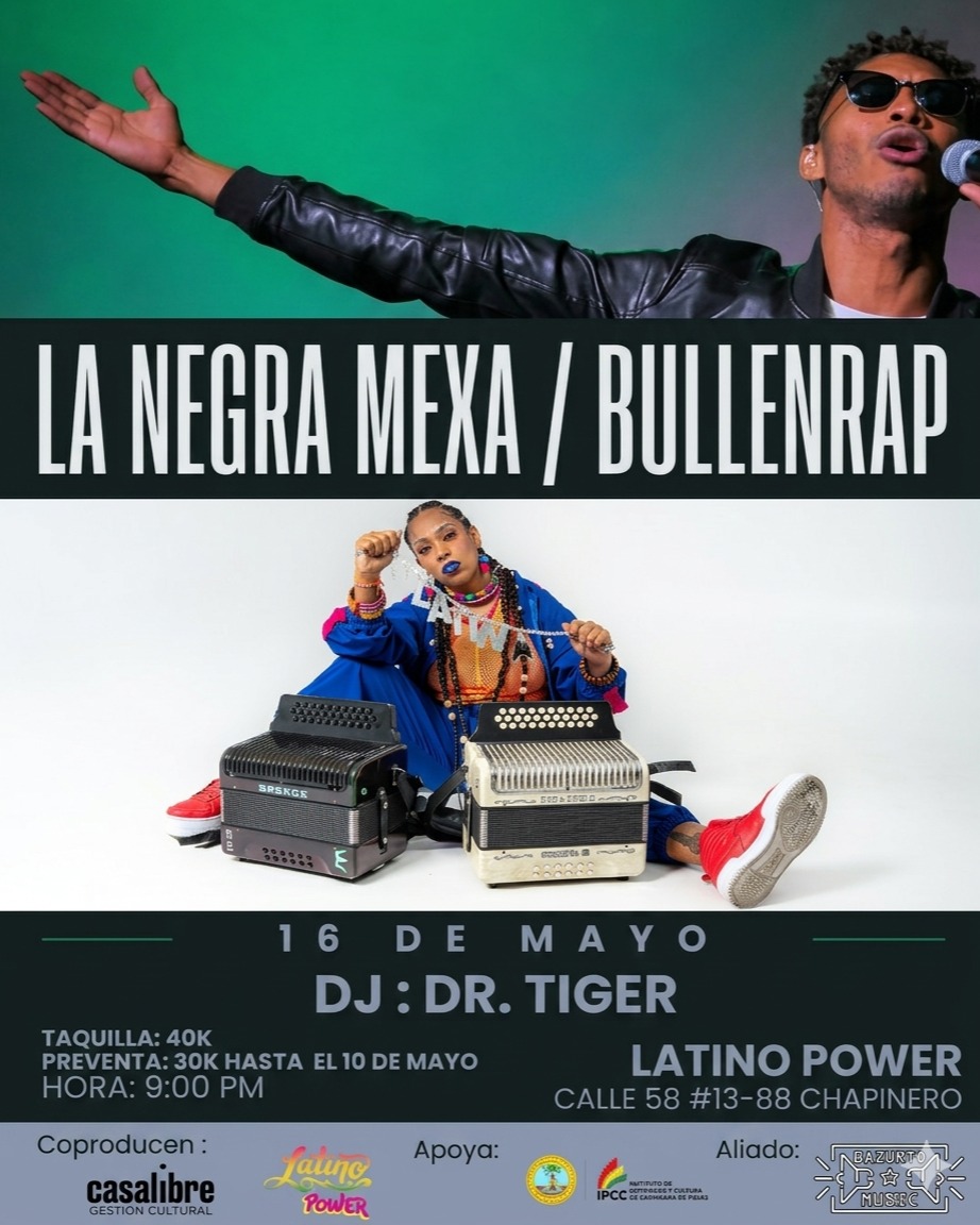 LA NEGRA MEXA / BULLENRAP es un concierto que reúne los ritmos de Colombia y México en Latino Power, en Bogotá. Una noche donde los tambores, el acordeón y los beats se mezclan en un mismo latido, con presentaciones de Bullenrap, La Negra Mexa y el DJ Dr. Tiger. Un encuentro musical íntimo y potente para quienes buscan sonidos latinoamericanos contemporáneos en vivo.