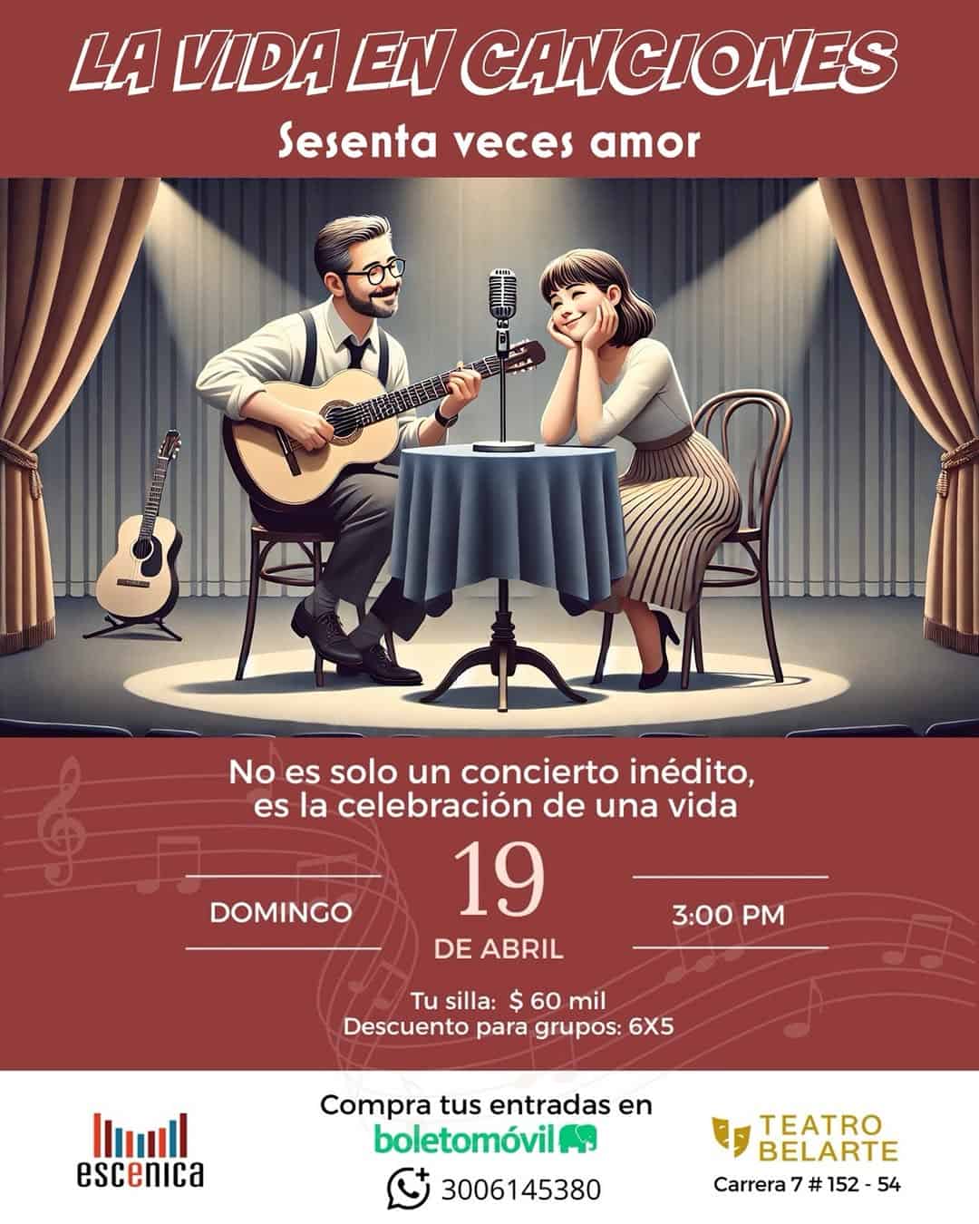 “La vida en canciones – Sesenta veces amor” es un concierto íntimo en Bogotá donde Óscar Alarcón presenta su producción inédita para celebrar sus 60 años. En el Teatro Belarte, el público podrá disfrutar de sus canciones, anécdotas y momentos de vida en una velada cercana y emotiva. Un evento musical único que combina historias personales y música en vivo, ideal para los seguidores de “¡Sí, acepto!” y amantes de los conciertos en Bogotá.