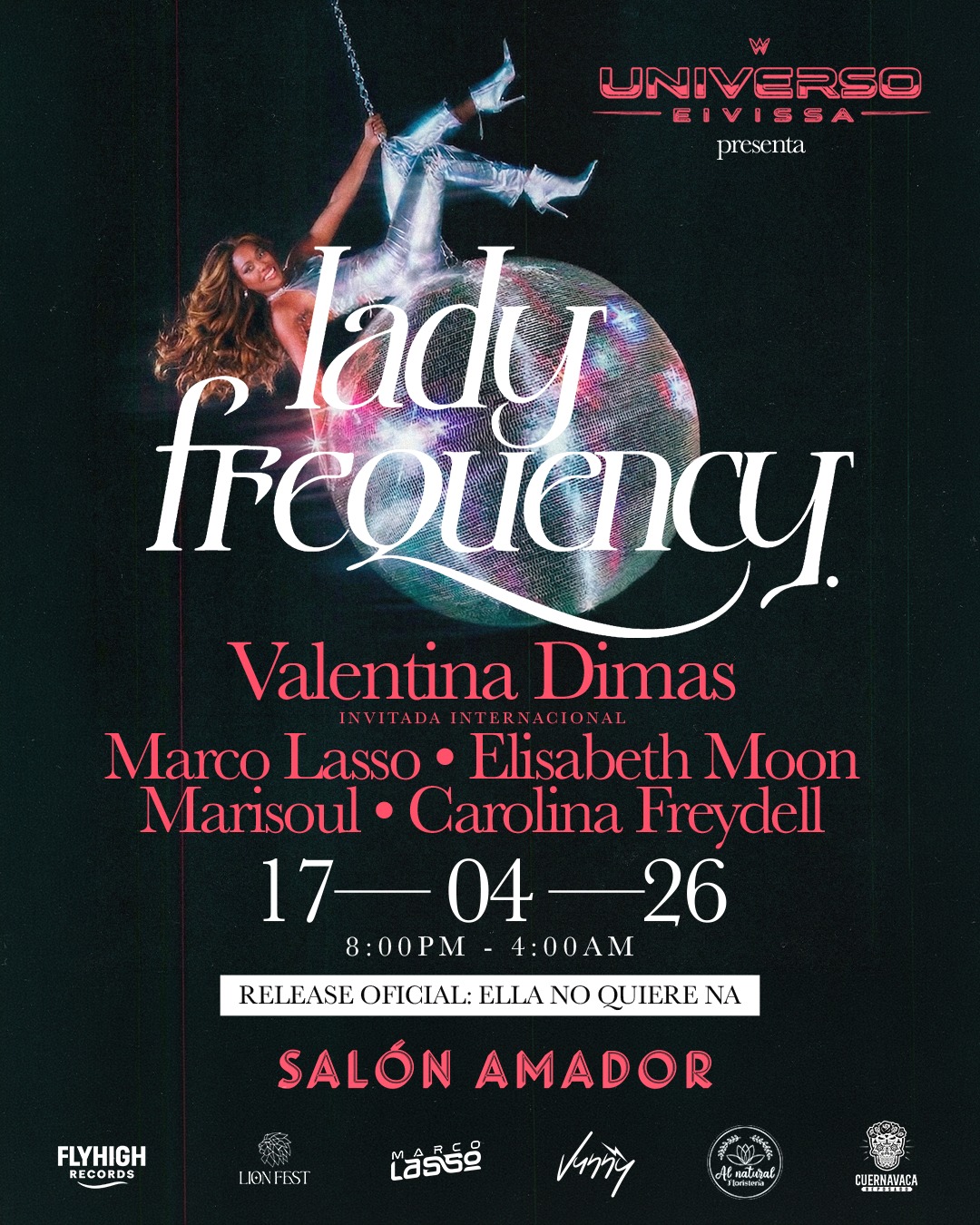 Lady Frequency es una noche de DJ set y clubbing en Salón Amador, donde el Universo Eivissa presenta una edición especial liderada por la energía femenina y la curaduría de Marco Lasso en Medellín. Con artistas como Valentina Dimas, Elisabeth Moon, Marisoul y Carolina Freydell, este evento promete una experiencia intensa de música electrónica y el release oficial de “Ella no quiere na”, ideal para quienes buscan una fiesta inmersiva y cuidadosamente seleccionada.
